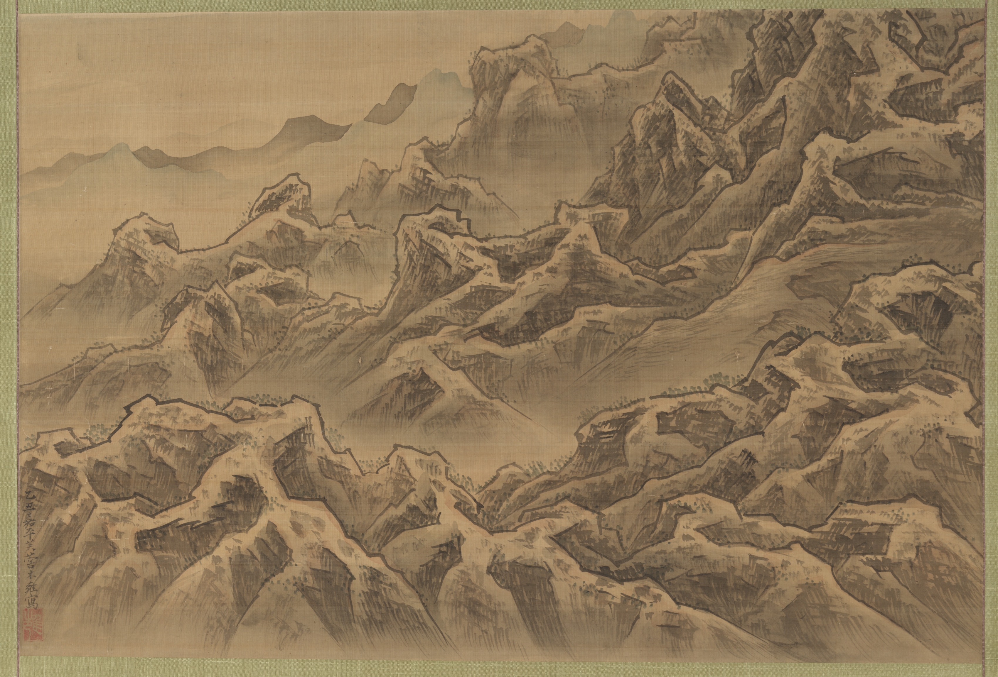 Sepia-toned drawing of mountain range, many peaks and ridges, some shrouded in mist; thin green border around edges; small red mark in bottom-left corner; signature or seal. Title: Mountains and Ravine Artist: Suzuki Fuyō.
