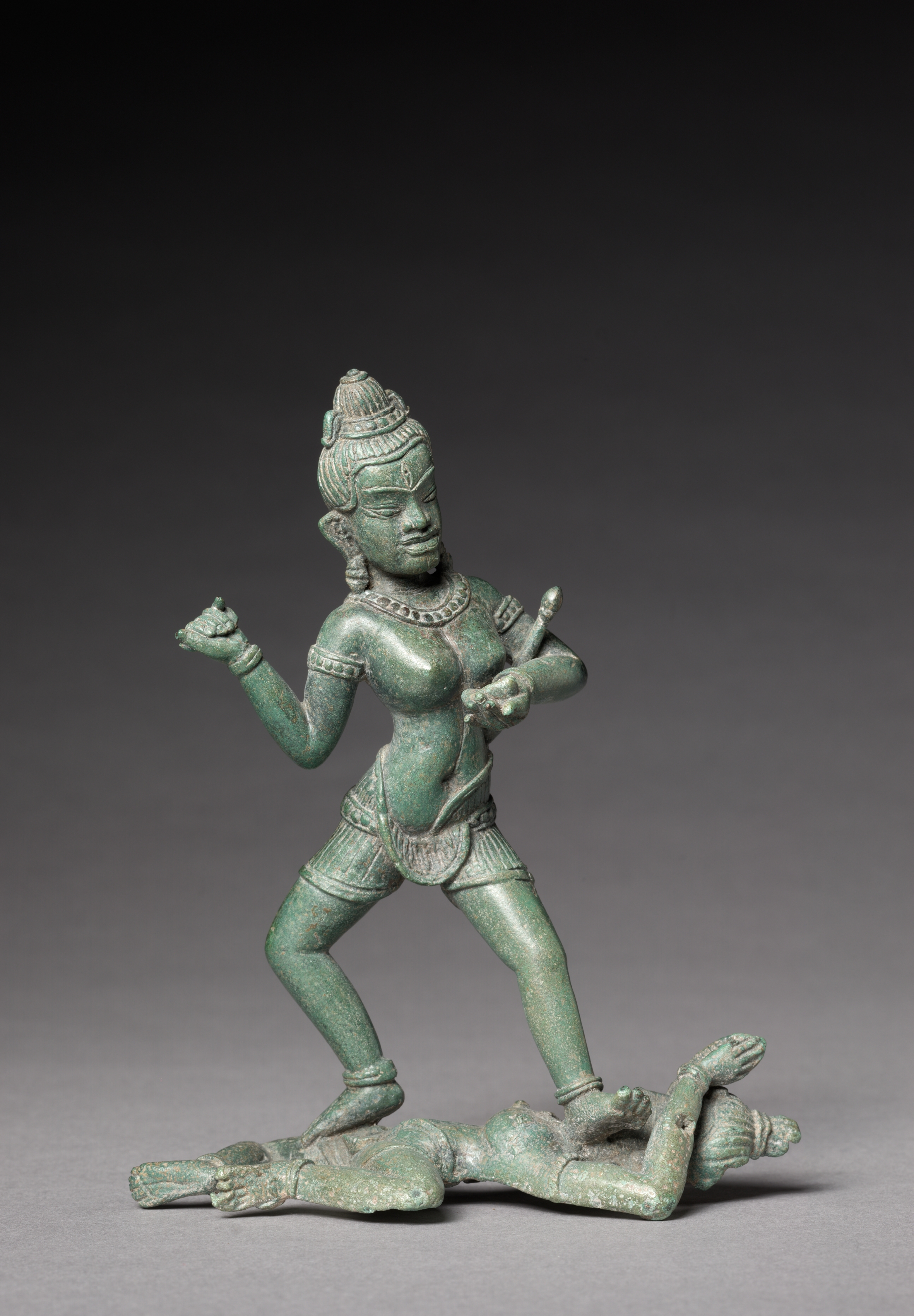Green metal sculpture titled "A Dakini" by an unknown artist, depicting a female figure standing over a male figure. The female figure wears a short top and shorts, with her hair styled in a tall coiffure. She has earrings, a necklace, and bracelets on both wrists. Her left leg is straight while her right leg is slightly bent. Her arms are bent at the elbows; her right hand is positioned near her chest and her left hand is to the side. The male figure lies on his back with his legs bent and arms raised. The background of the image transitions from dark at the top to light gray at the bottom.