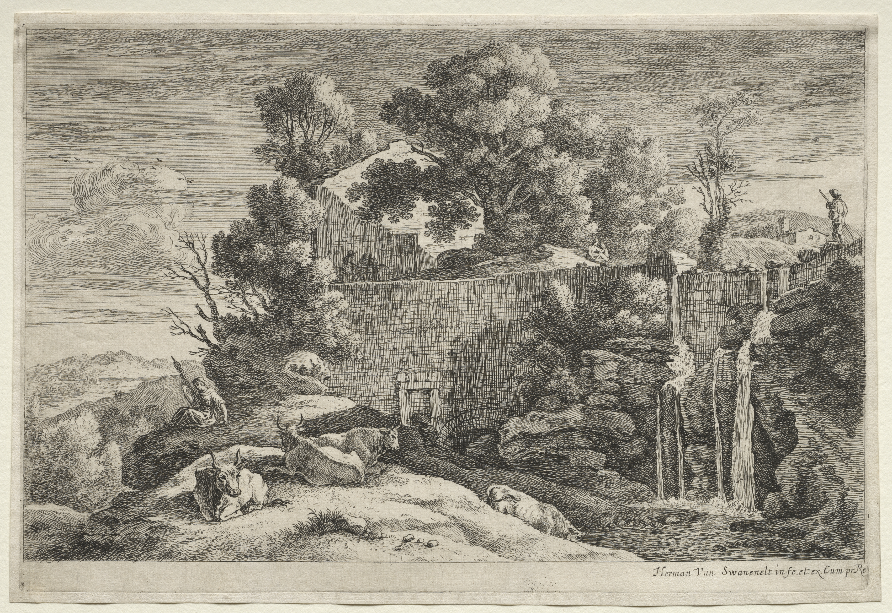 The image depicts a landscape with a woman spinning. The scene features a rocky hillside with a woman sitting on the left, holding a spindle and looking down; she wears a long dress. The hillside has several animals, including goats and sheep. To the right, there is a waterfall cascading down the rocks. In the background, a stone wall runs horizontally across the image, with trees and a building on top of it; another structure is on the right side of the wall. The sky above is cloudy. The entire scene is rendered in black and white. The title "Landscape with a Woman Spinning" and the artist's name are written at the bottom.
