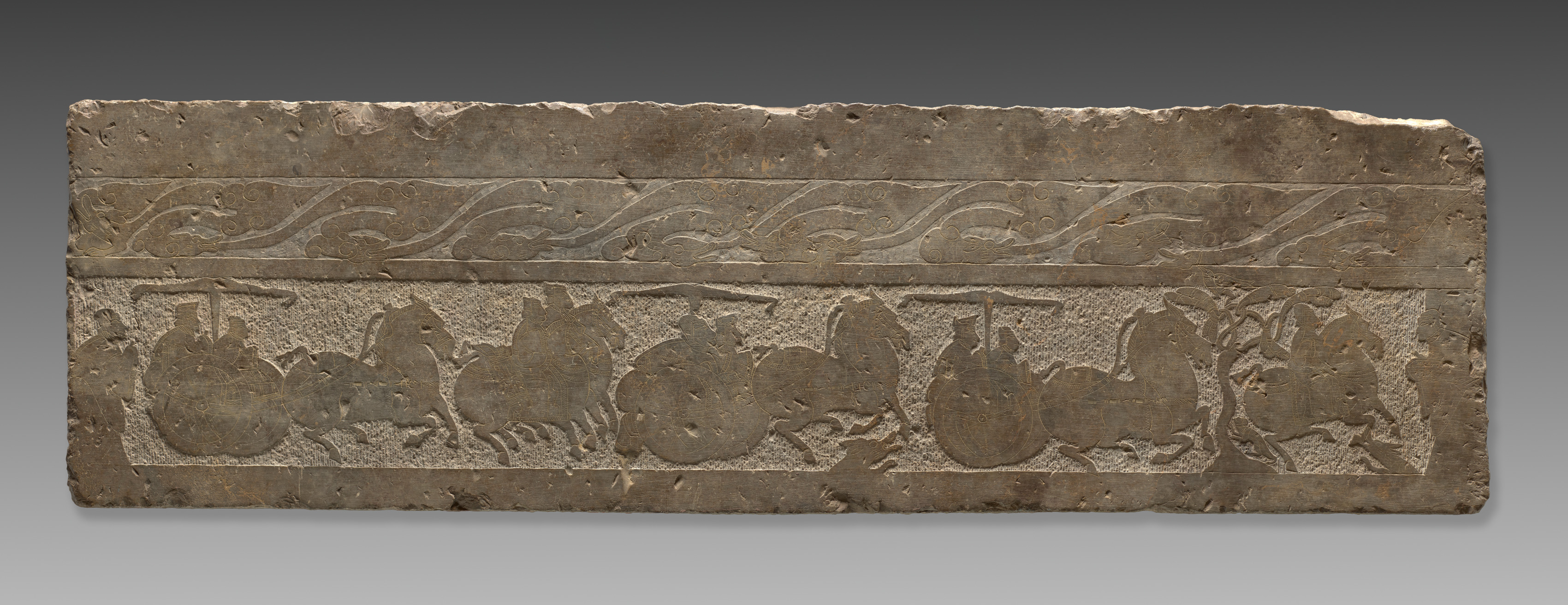 The image shows a rectangular stone relief. The stone is grayish-brown with darker and lighter areas. The top and bottom edges are rough and uneven. The top third of the relief features a design of raised wavy lines. The bottom two-thirds has a raised border at the top and bottom. Inside the border, there is a procession of four chariots, each pulled by two horses or other animals. The chariots and animals are in relief, as is a figure standing at the back of the first chariot. The chariots have wheels. The background behind the stone is gray and darkens towards the top.