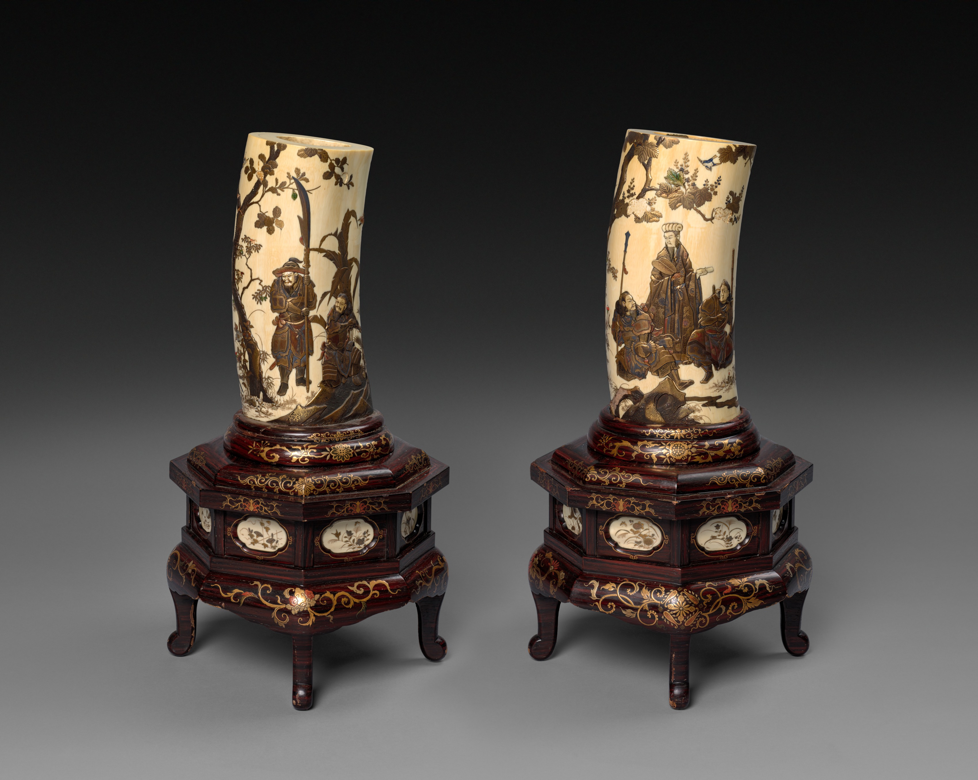 Two tall, narrow vases, titled "Ivory Tusk Vases", are displayed on dark wooden stands with gold accents. The vases are made of ivory and are cylindrical in shape, with a slightly flared top and bottom. The vase on the left features a design of two people standing on a rocky surface, with tree branches and flowers. The vase on the right depicts a group of people in robes. The dark wooden stands have a hexagonal base with four legs, a flat top, and a small drawer on each side. The stands are decorated with gold accents, including swirling patterns and small oval-shaped inlays. The background is a gradient that transitions from black at the top to gray at the bottom.