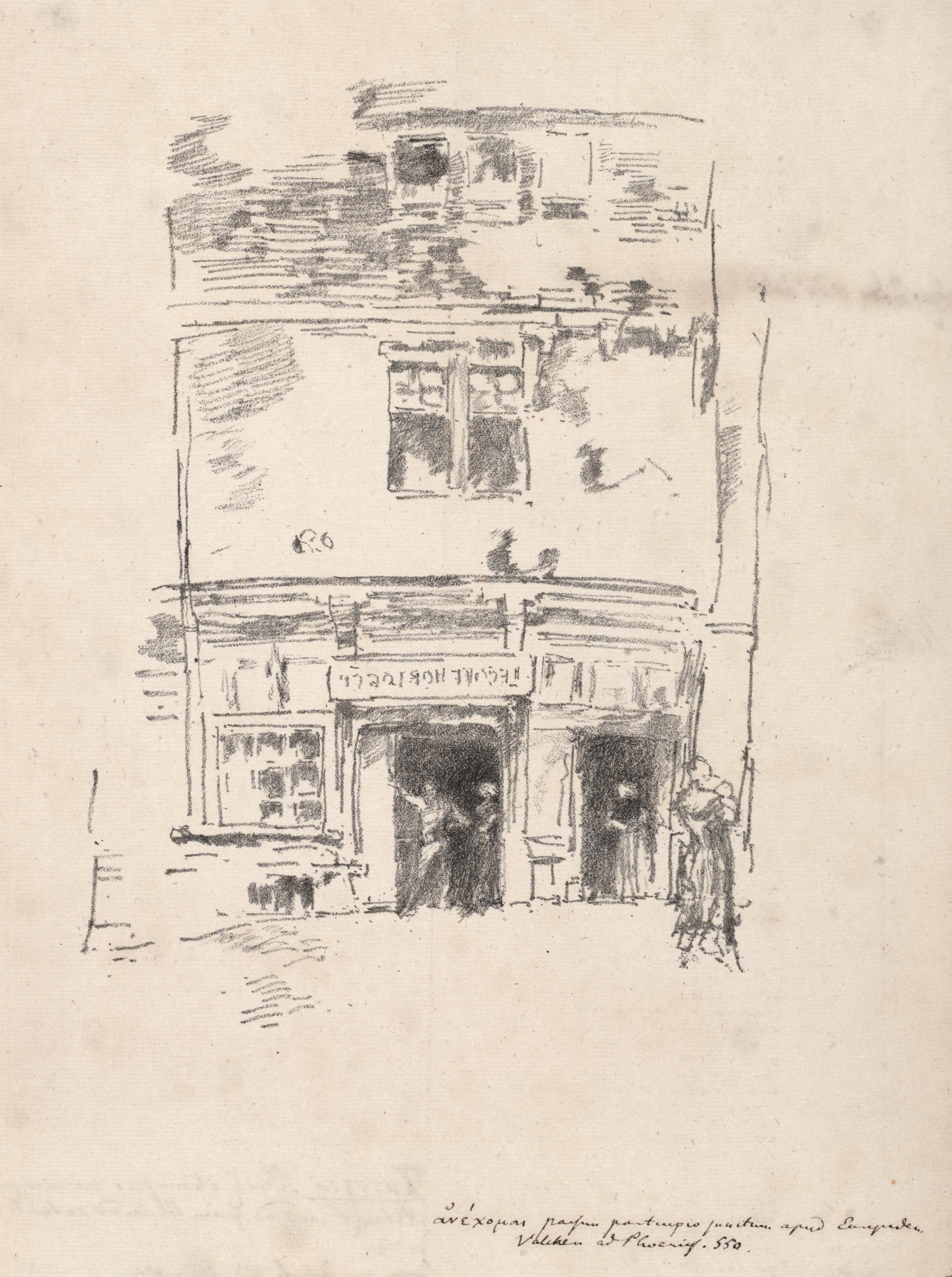A two-story building with a sign above the doorway reading "THE CLOCKMAKERS". The building has a wide central doorway with a person standing inside; there is another doorway to the right with a person standing outside; the window to the left of the central doorway reads "CLOCKMAKERS" on the shop window; a row of four small windows on the upper story; two people stand on the sidewalk to the right. The sketch is rendered in dark gray pencil on a light brown background.