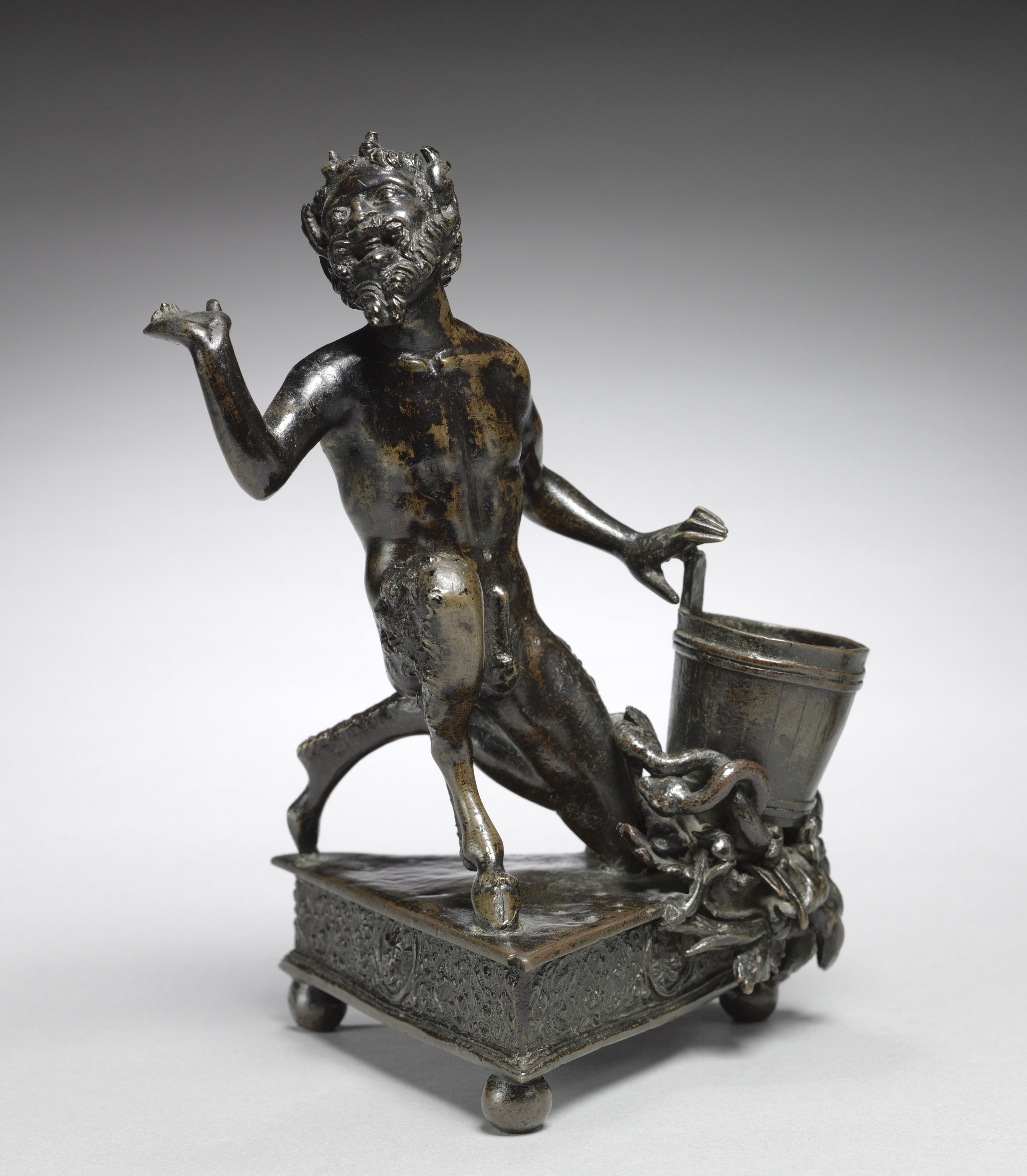 Dark metal sculpture of a kneeling satyr. The satyr has a beard and horns on his head. He is nude with his left knee on a base and his right leg bent in front of him. His left arm is bent at the elbow with the hand in front of him. His right arm holds the handle of a bucket. The bucket sits next to him on the right. The base is square with a decorative edge and small feet. The background fades from dark to light gray. The sculpture appears to be made of bronze or another dark metal.