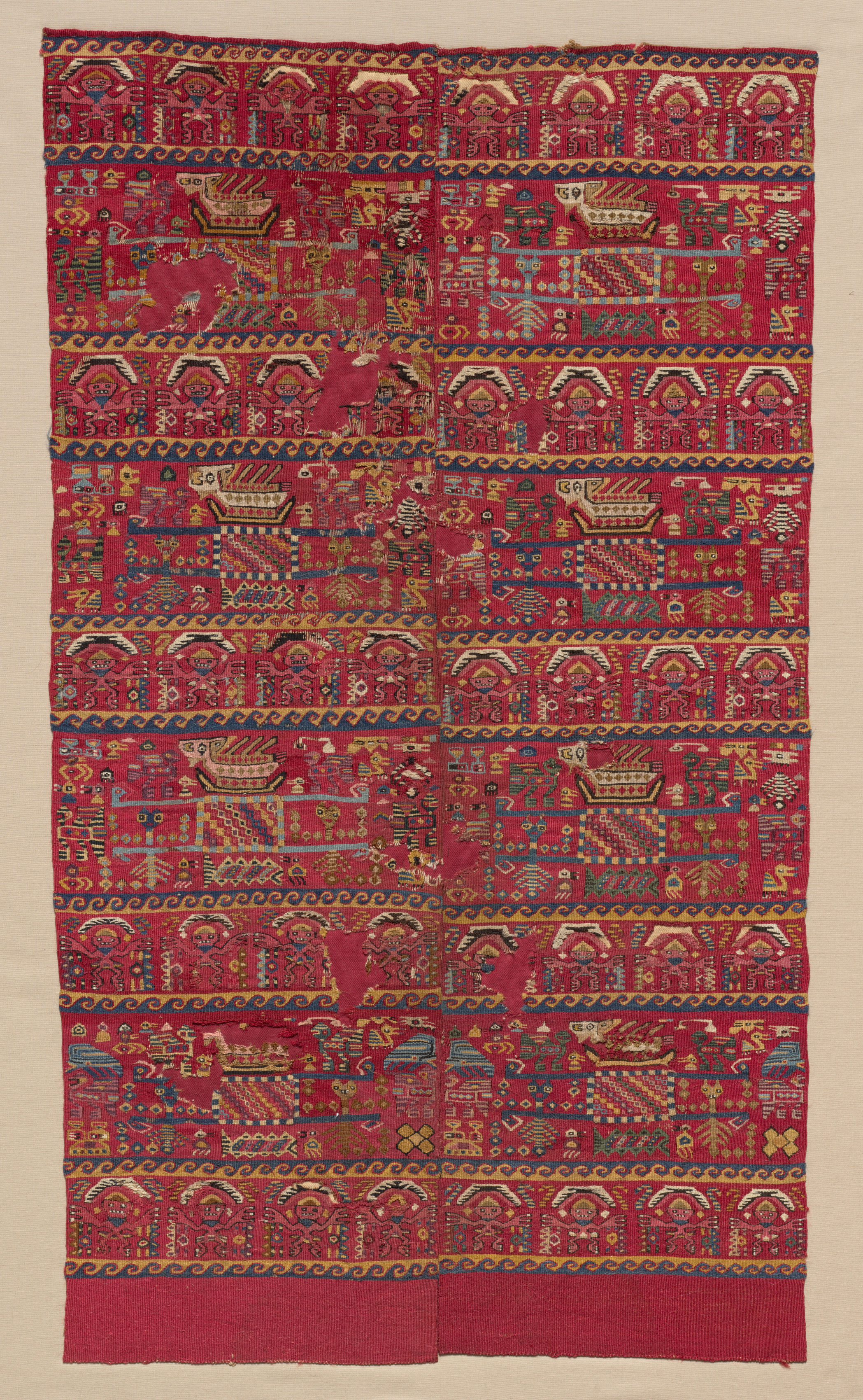 Two tapestry-woven panel fragments by an unknown artist. The image shows two fragments of a tapestry side by side, making one larger rectangular piece. The dominant color is red. The tapestry is divided into rows and columns of geometric shapes and figures. There are repeating patterns of various shapes including diamonds, triangles, and rectangles. Some of the shapes contain simple figures of animals and people. The rows are separated by horizontal strips with a repeating linked motif. At the top and bottom, there are solid red borders. The background behind the tapestry is beige.