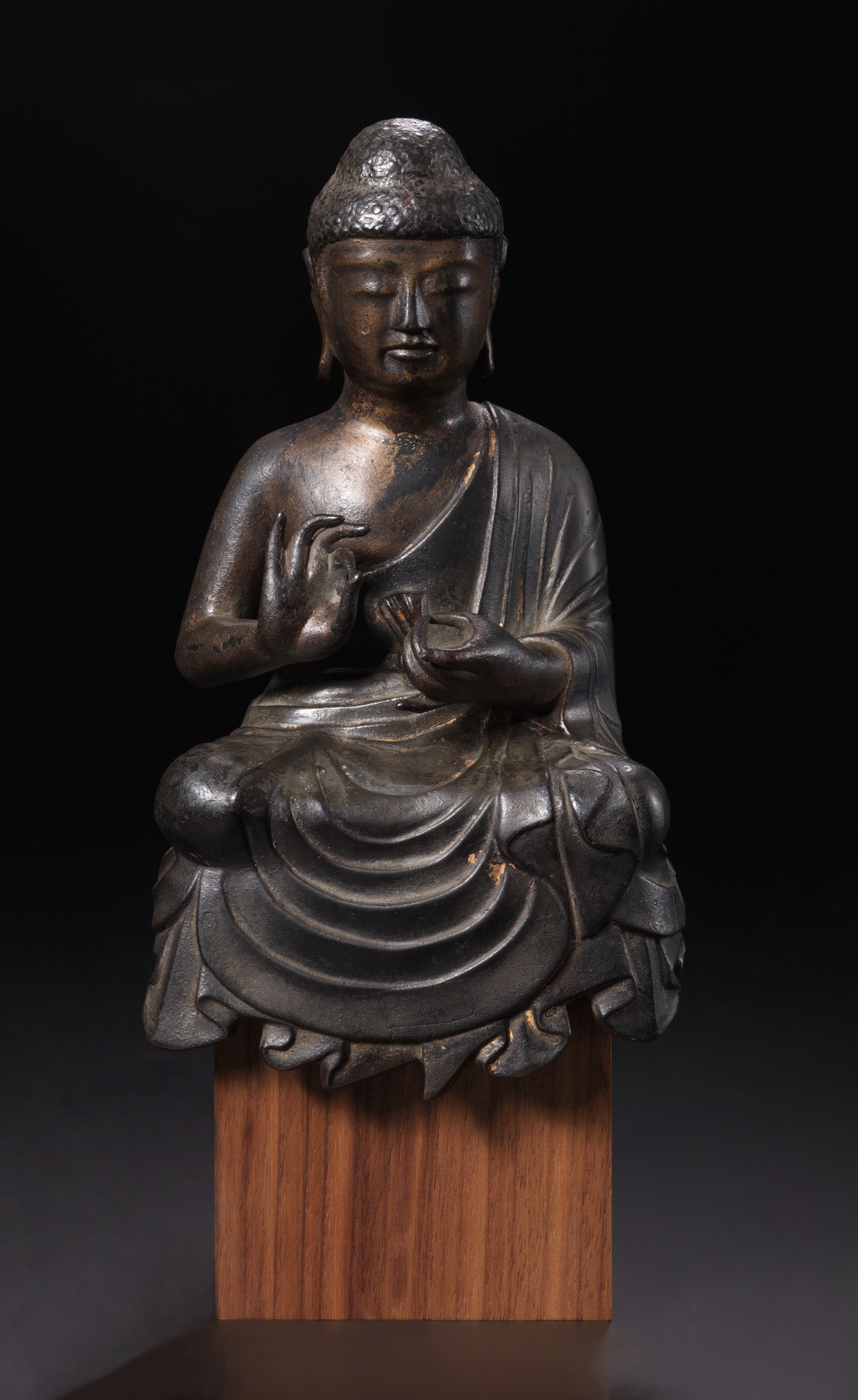 The bronze sculpture depicts A Preaching Buddha by artist. The Buddha is seated cross-legged on a lotus flower base. The figure has a serene expression with eyes closed and a subtle smile. The right hand is raised in front of the chest, and the left hand rests on the lap. The figure wears a robe draped over the left shoulder, with folds carved in detail. A distinctive protuberance tops the head. The sculpture sits atop a rectangular wooden base. The background is dark, transitioning from black at the top to gray at the bottom.