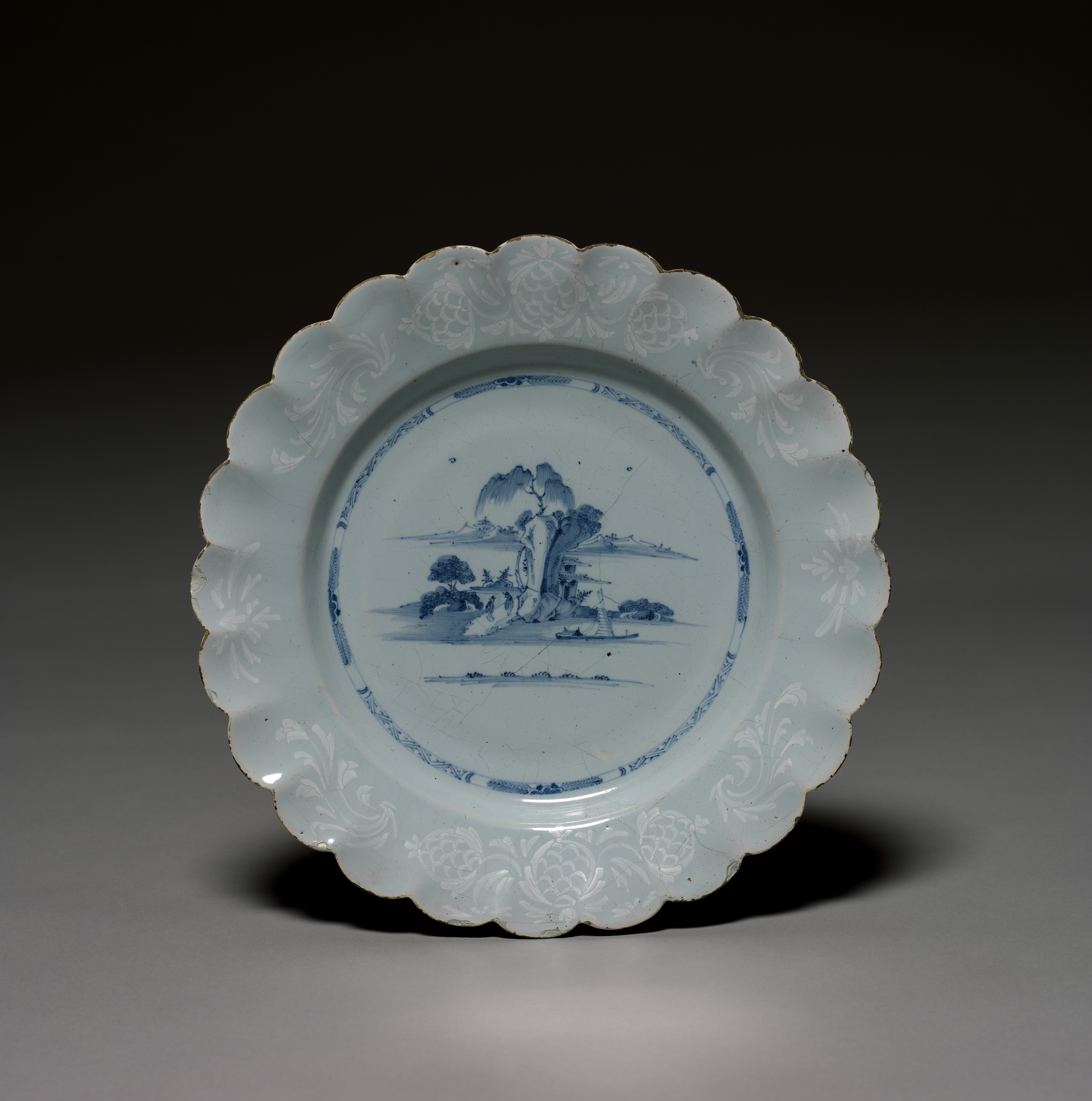 Pale blue plate with scalloped rim; rim decorated with white foliage; circular blue and white design on face, with blue border; blue mountainous scene with trees and body of water; some cracking.