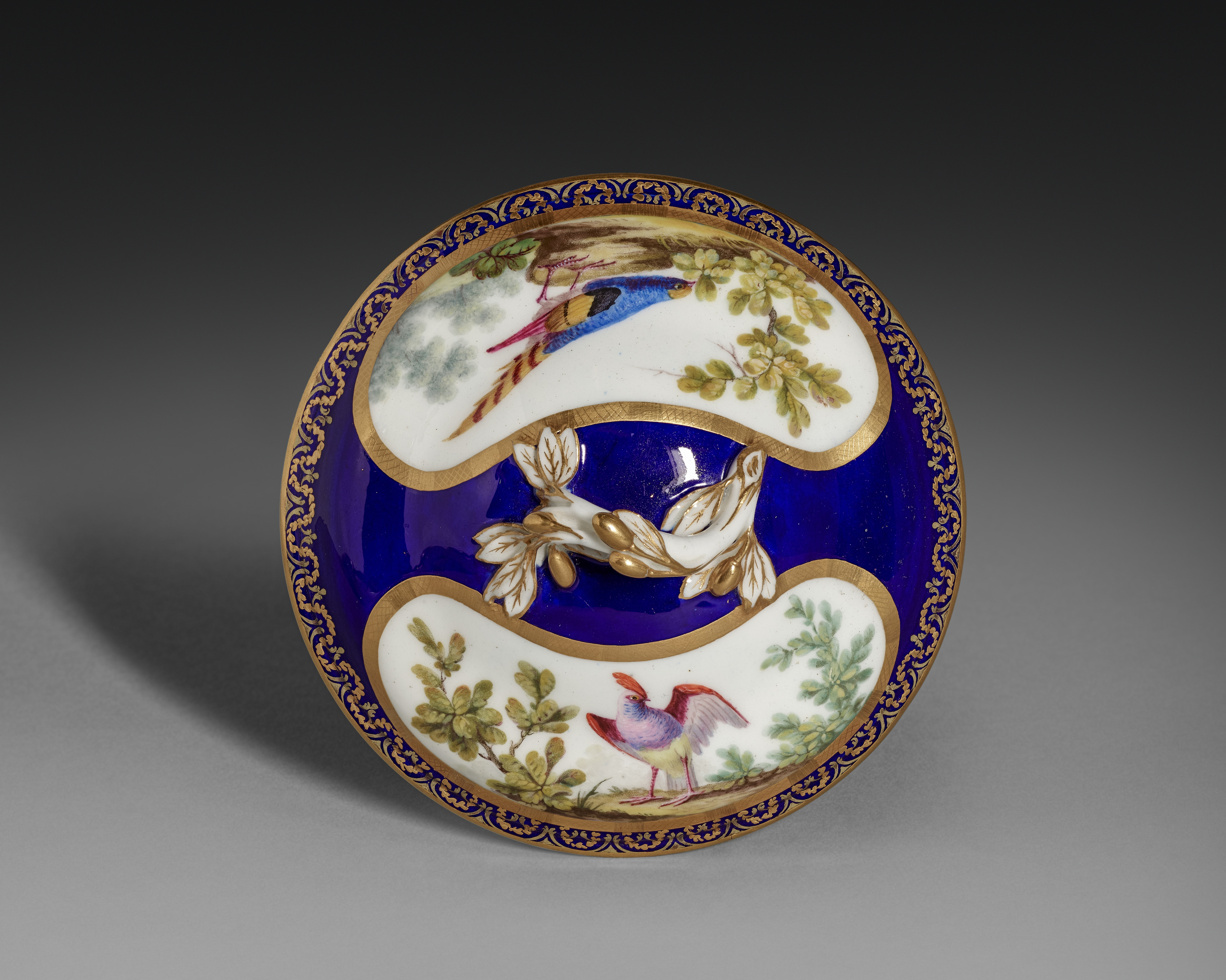 Royal blue and gold bowl with rounded, wavy sections containing colorful birds and foliage. Gold accents and ornate design around rim. White background sections contrast with blue and gold. Birds depicted in various poses amidst green leaves.