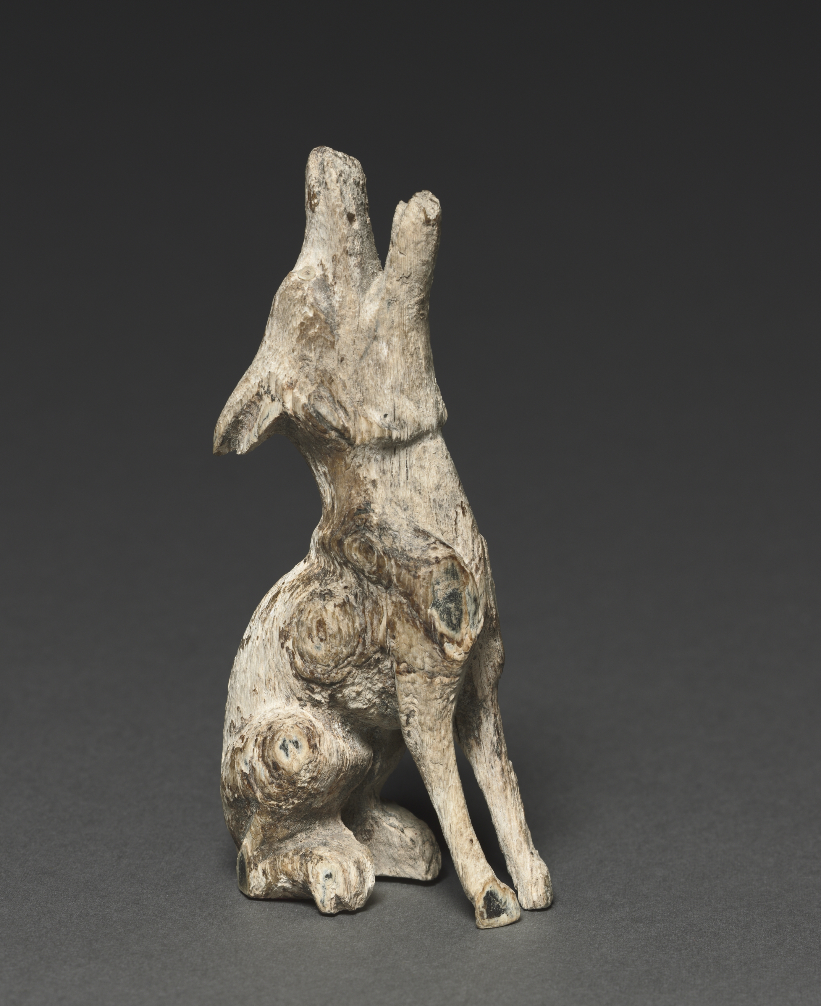A sculpture carved from driftwood depicting a Howling Wolf by an unknown artist. The sculpture is positioned on its haunches with two front legs visible. The overall color of the sculpture is a weathered light gray with darker gray patches. The body is in a sitting position with the back legs bent underneath. The head is tilted back with the mouth open as if howling. The ears are triangular and pointed. The eyes are not defined. The sculpture has a textured surface with visible marks and grooves from the carving process. The background is a dark gray color.