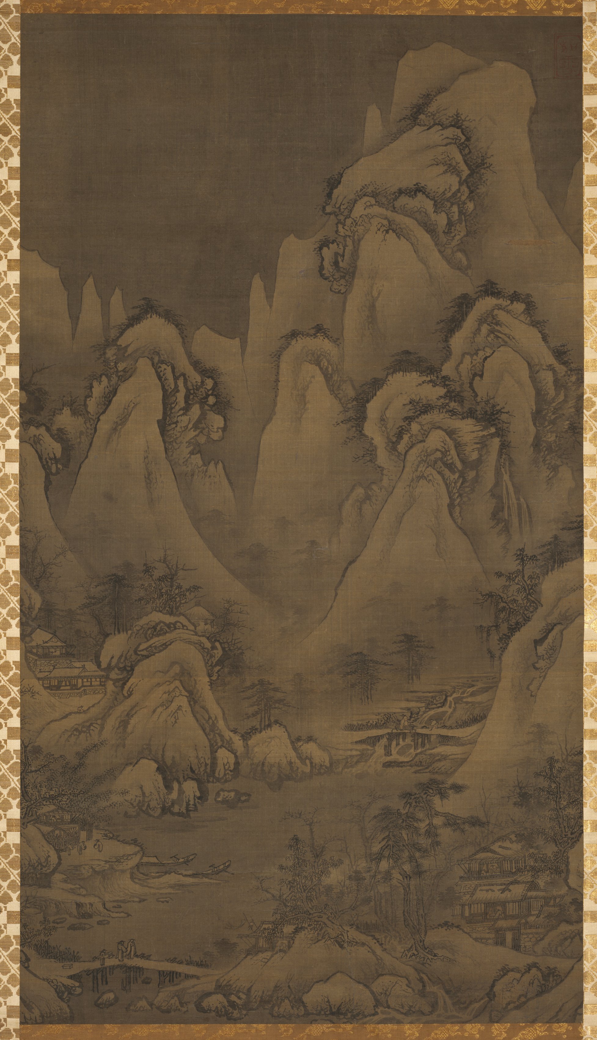 Brown and white painting. Border around the painting made of interlocked light brown diamonds on cream background. Large mountain range spanning most of the image. Snow on the mountains. Trees growing on mountains. Three buildings near the base of the mountains. Two on left. One on right. A river running through the landscape.