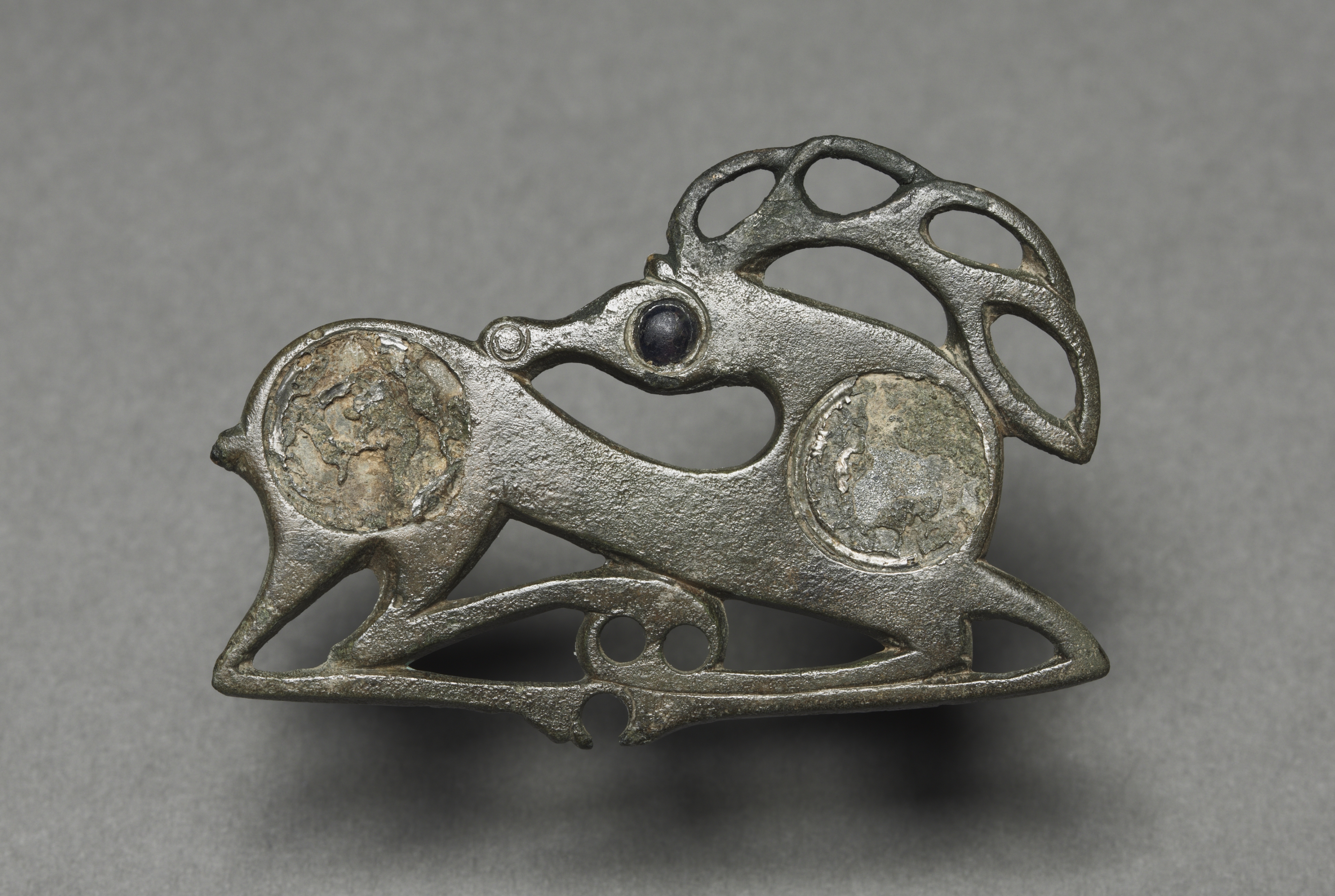 Metal brooch in the shape of a recumbent stag. The brooch is lying down on its stomach with its legs stretched out in front and head raised. Two circular areas on the brooch's sides resemble the stag's hips. The brooch's body features a textured surface. A black circular setting serves as the eye. A decorative element on the brooch's back resembles antlers with circular cutouts. Two circular areas on either side of the brooch have a raised design on a lighter background. The brooch is on a gray background.