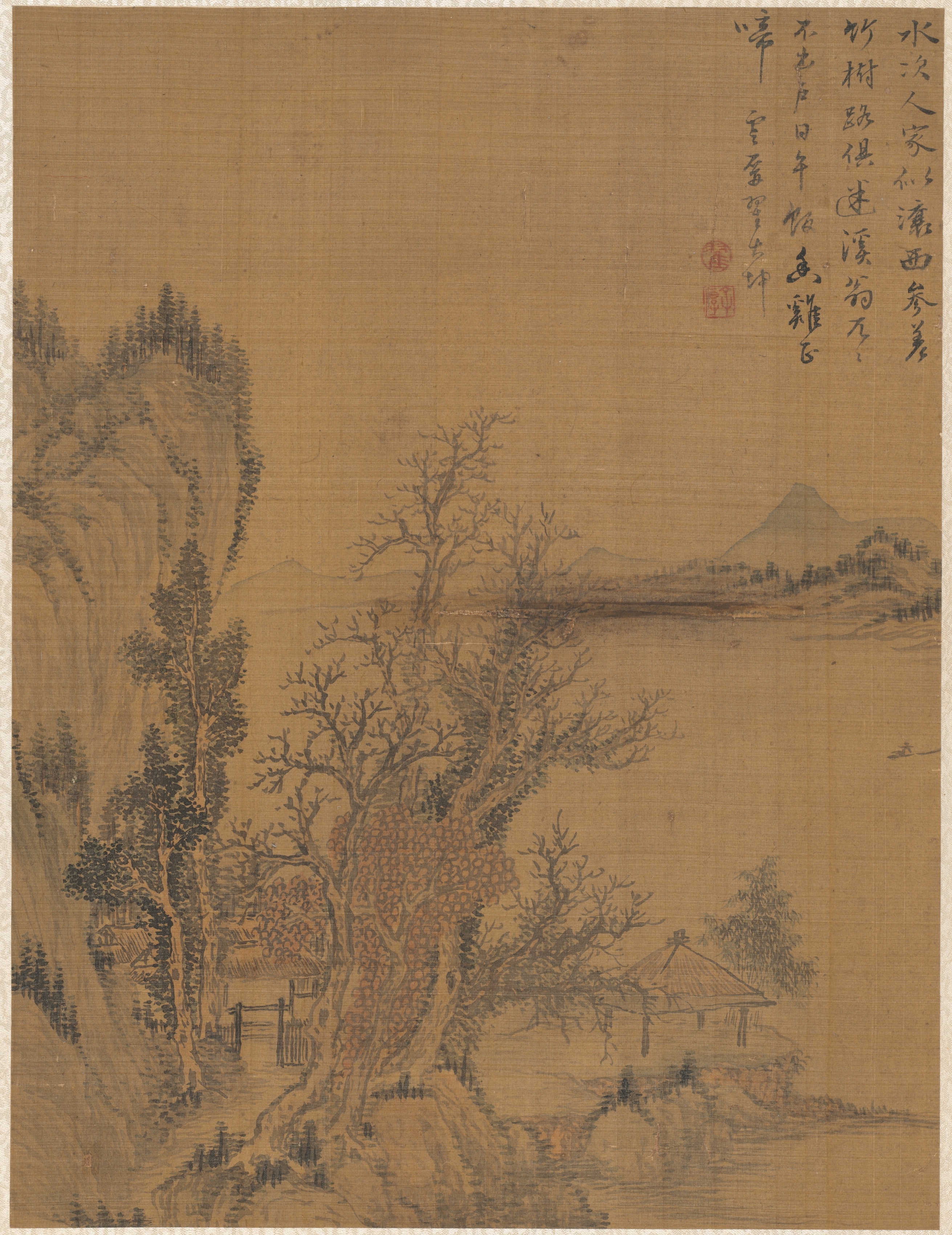 Landscape by Zhai Dakun. A painting on light brown fabric. A body of water spans central background to right. A mountain juts into the sky on right side of the water. Brown trees on the left extend halfway across the image. A leafless tree sits on a mound with a pagoda-like roofed structure behind. A fenced area sits behind the mound. A vertical column of Asian script sits at the top right. A small red stamp is below the script.