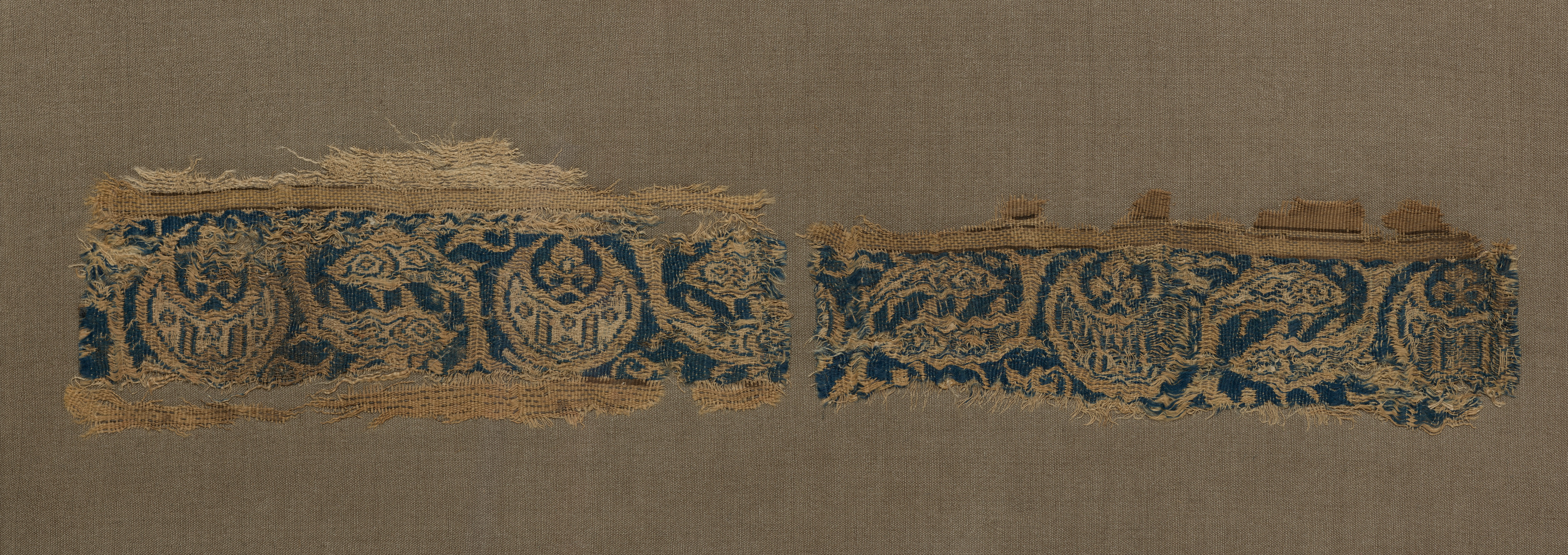 Fragment of a Band by unidentified artist. Two horizontal strips of fabric with blue background and tan design. The strips are placed side-by-side. The left strip has frayed edges at top and bottom. The right strip has frayed edges at bottom and straight edge at top with two short protrusions. The tan design features intricate patterns and shapes on both strips. The background of the image is a solid brown color.