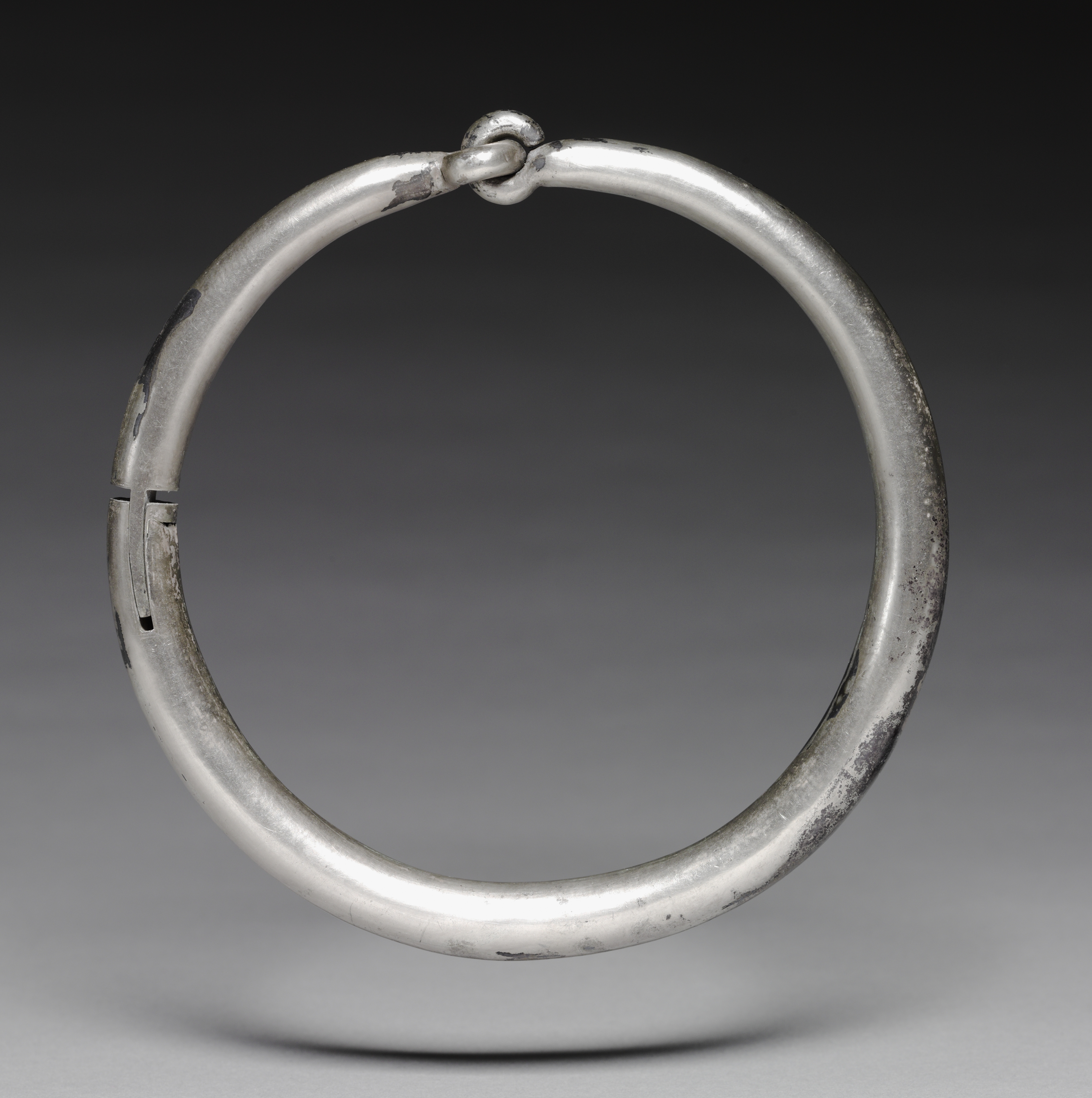 Silver ring, circular, thick band, rounded cross-section. Small loop at top. Dark spots and scratches on surface. Background fades from black at top to gray at bottom. Title: Torque. Artist unknown.