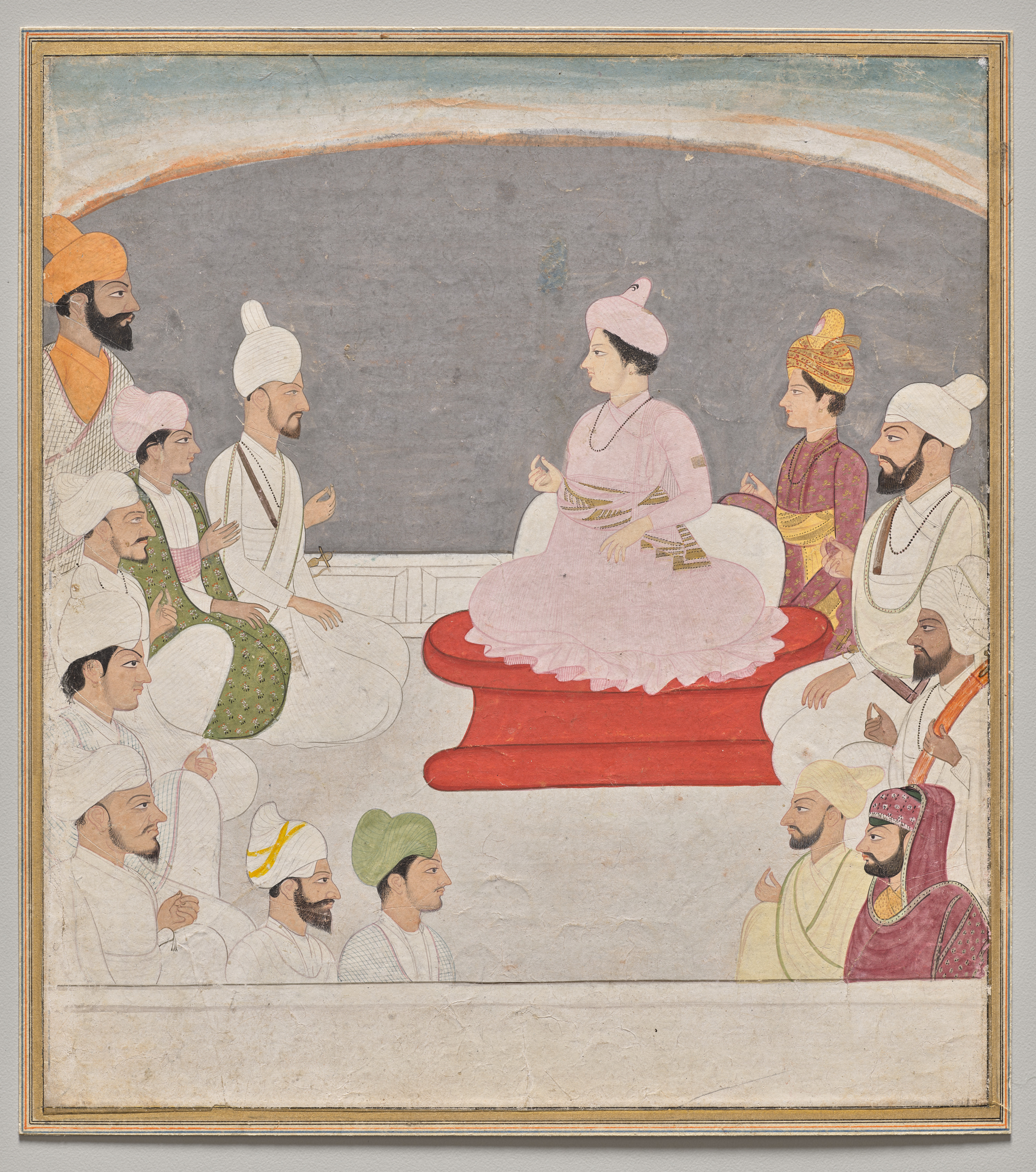 Raja Sansar Chand of Kangra and Courtiers. A man in a pink outfit sits cross-legged on a low platform covered in a red cloth, facing right. He wears a pink turban. He is surrounded by men in white and colored outfits and turbans. The men are sitting in two rows on either side of him. The row on the left side has one man wearing green and one man wearing orange. The row on the right side has one man wearing yellow and one man wearing red and gold. The men are looking at the central figure. The background is a gray wall with a curved top. The painting has a gold frame. The painting is on a beige-colored paper. The image is rectangular.