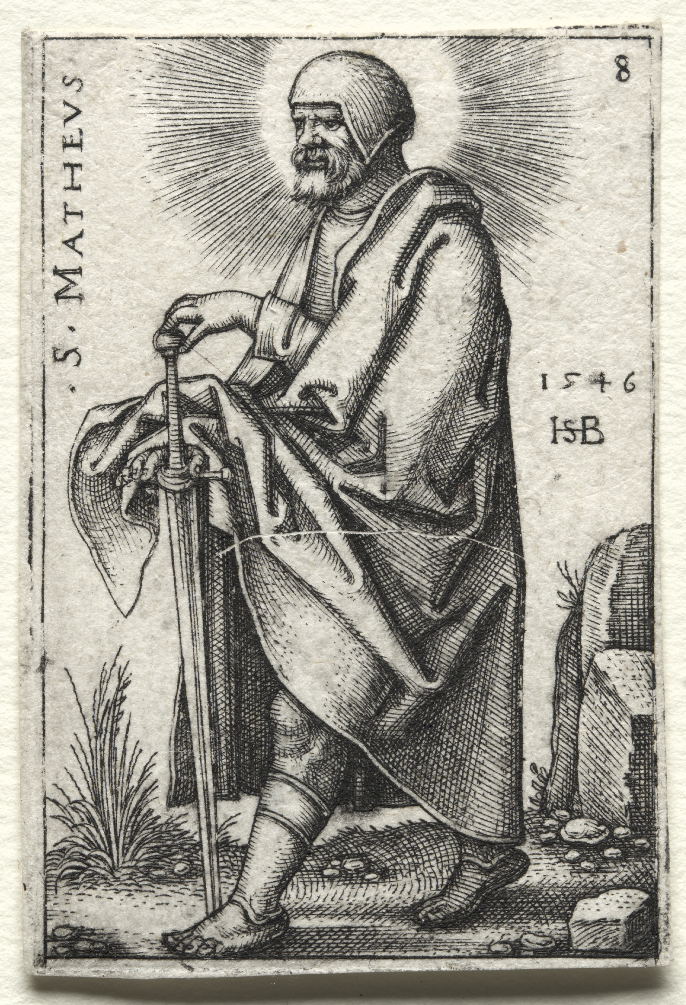 Black and white image of a man with a halo standing, wearing a robe, with a sword in right hand. The man has a beard and hair covered by a cap. He stands on a rocky surface with grass. Text on the left side of the image reads "S. MATTHEVS". The right side of the image has "1546" and "HSB". The top right corner has a number "8".