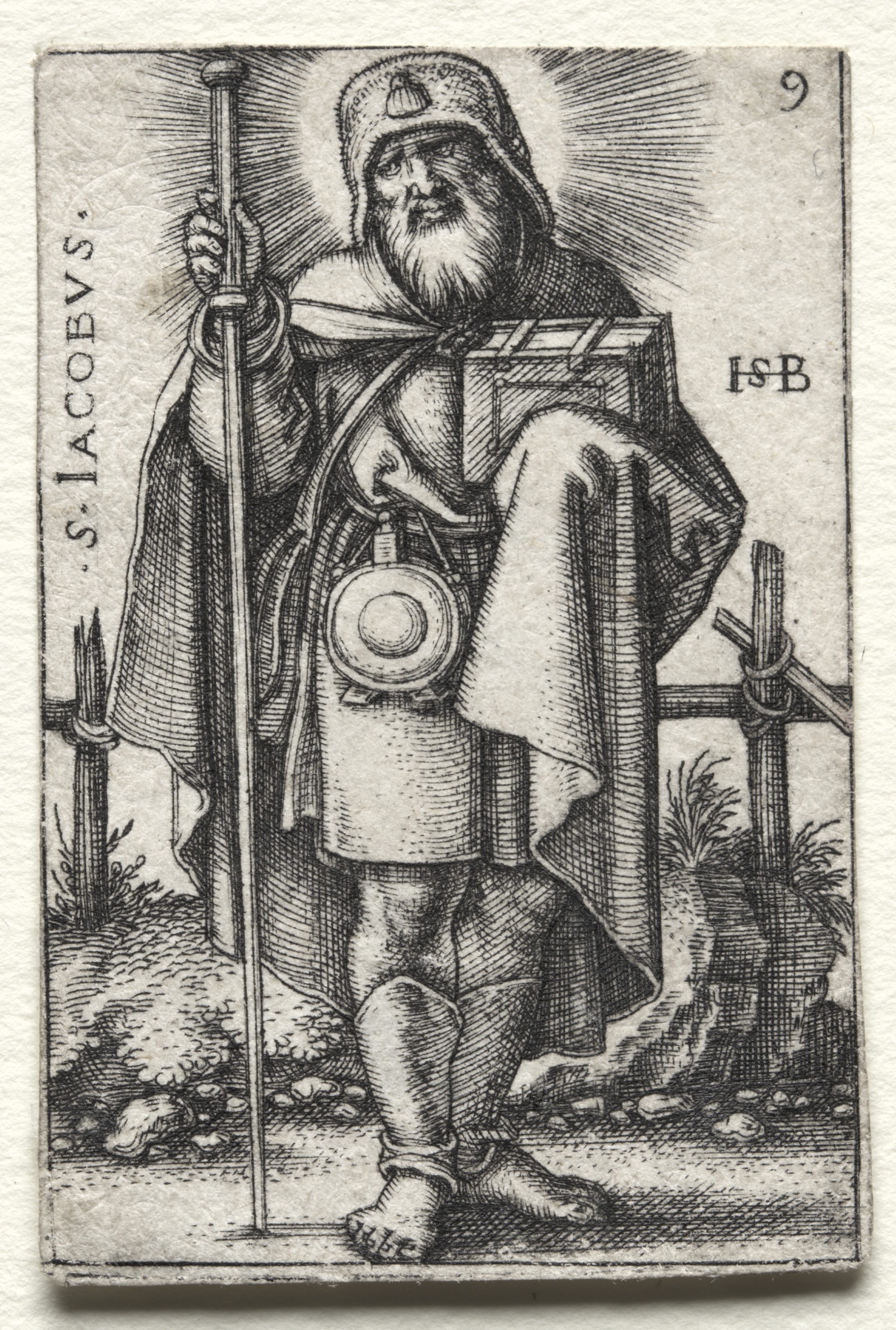 Black and white image of a man with a long beard wearing a hat, cloak, and boots, holding a staff and a book. The man is barefoot. He wears a hat with a small finial on top. A round object hangs at his waist. He holds a staff in his right hand and a book in his left. He stands in front of a fence. Text on the left side of the image reads "S. IACOBVS". Text on the right side of the image reads "HSB". A number "9" is in the upper right corner.