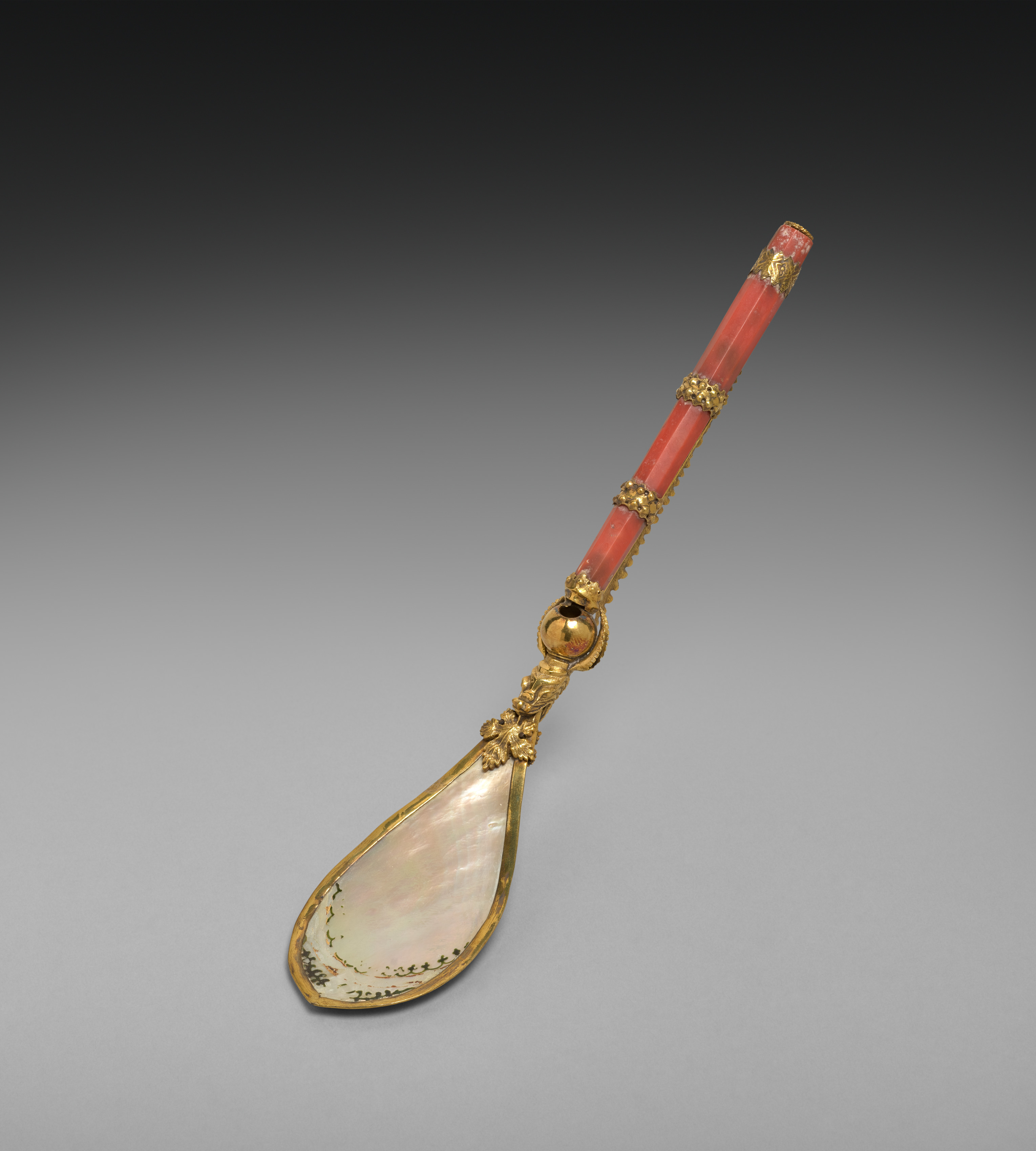 Coral and mother-of-pearl spoon with gold trim; handle is a salmon color, with three gold rings around near the neck; bowl of the spoon made from a teardrop-shaped piece of mother-of-pearl rimmed with gold; background fades from dark on top to light on bottom. Artist: Spoon.