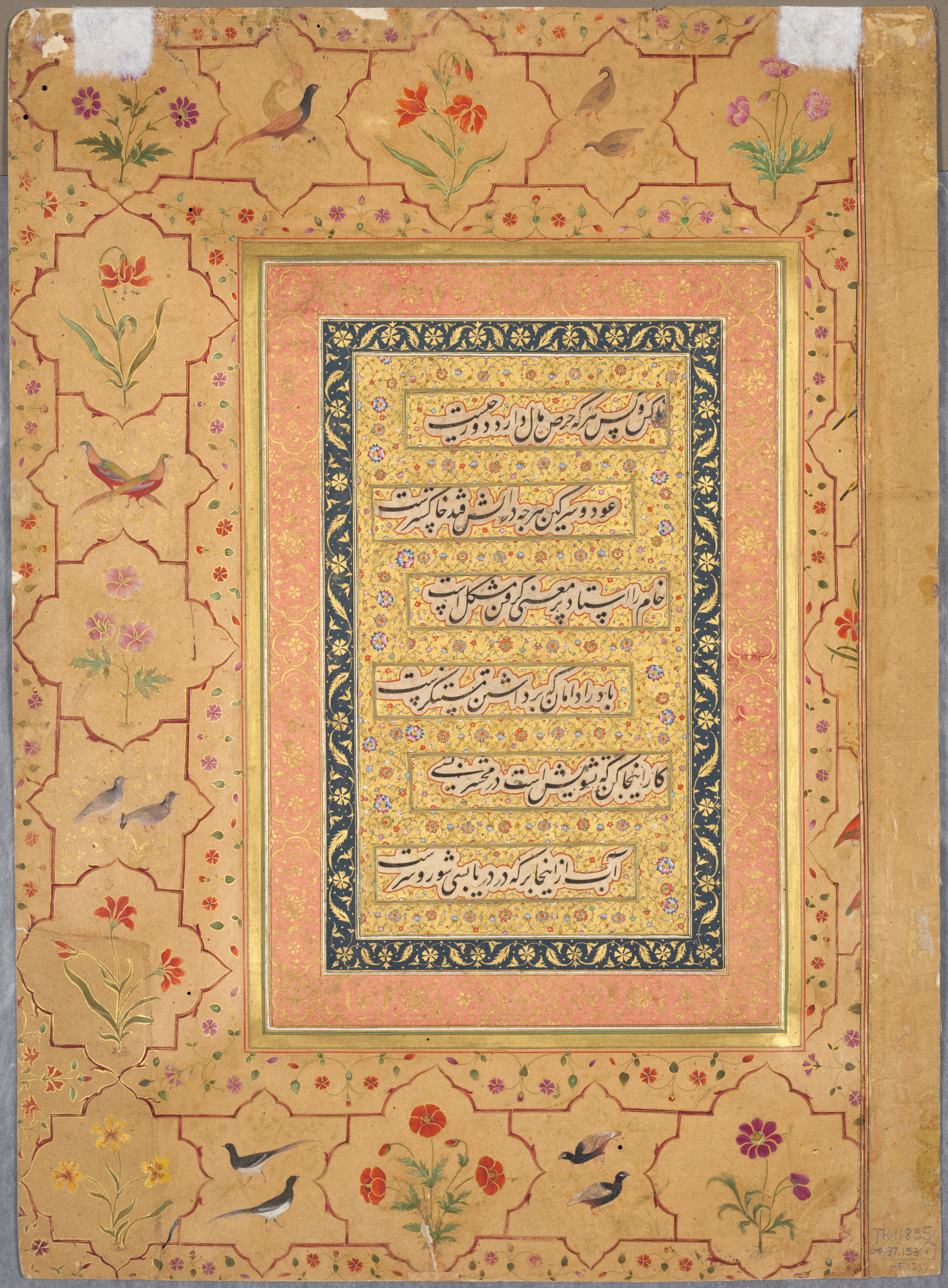 Calligraphy framed by an ornamental border with poppies and pairs of birds, from the Late Shah Jahan Album (verso)