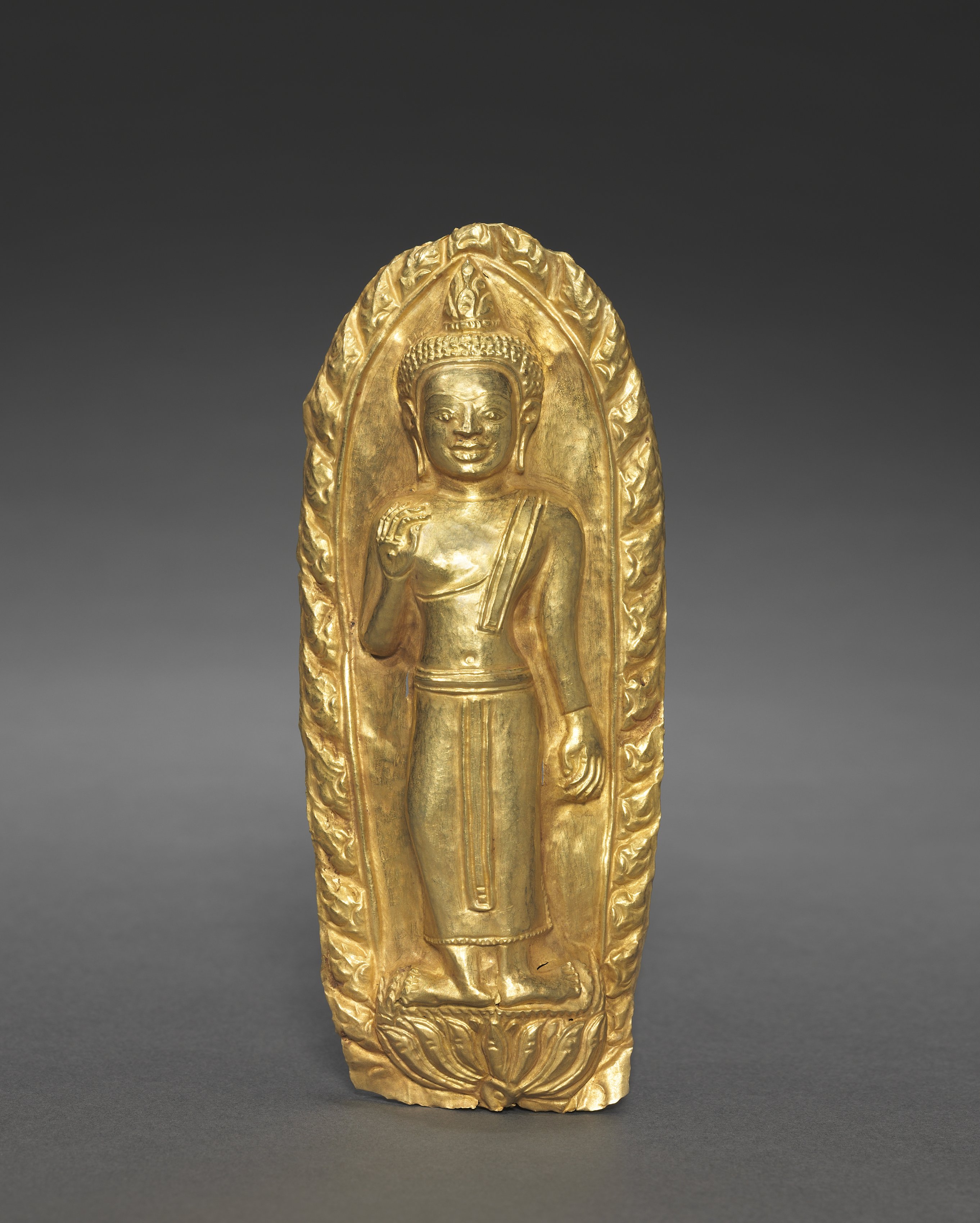Golden statue of a standing Buddha. Oval-shaped with a leaf pattern border. The Buddha is wearing a crown and a robe. The right hand is raised in front of the chest, and the left hand is down by the side. The statue has a plain gray background.