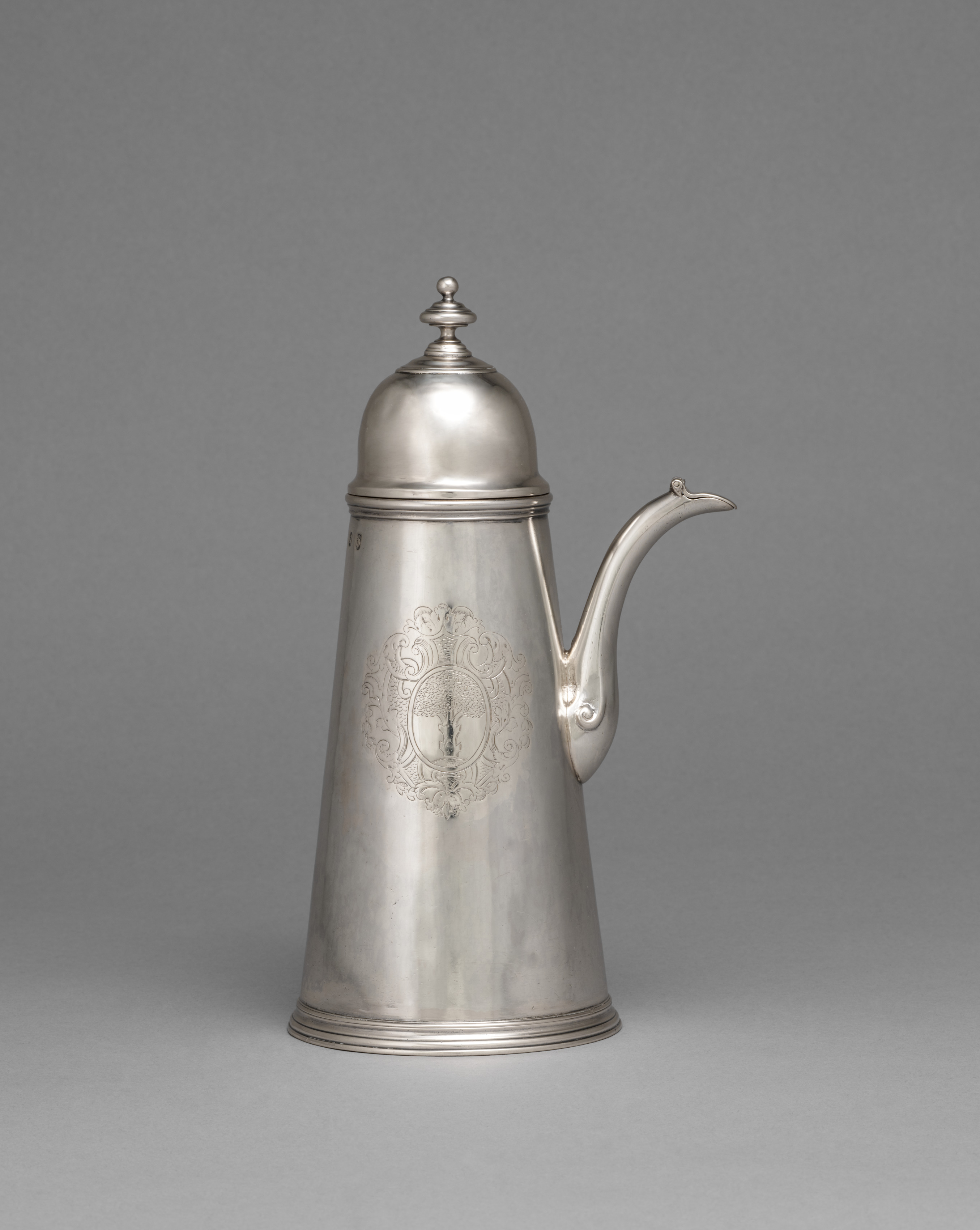 The Coffee Pot by John Chartier is a silver-colored metal object with a conical body and a long curved spout on the right side. The pot has a wide base that tapers upwards, with a small lip around the bottom edge. A decorative etching is visible on the front. The lid is domed with a small finial on top. The background of the image is gray.