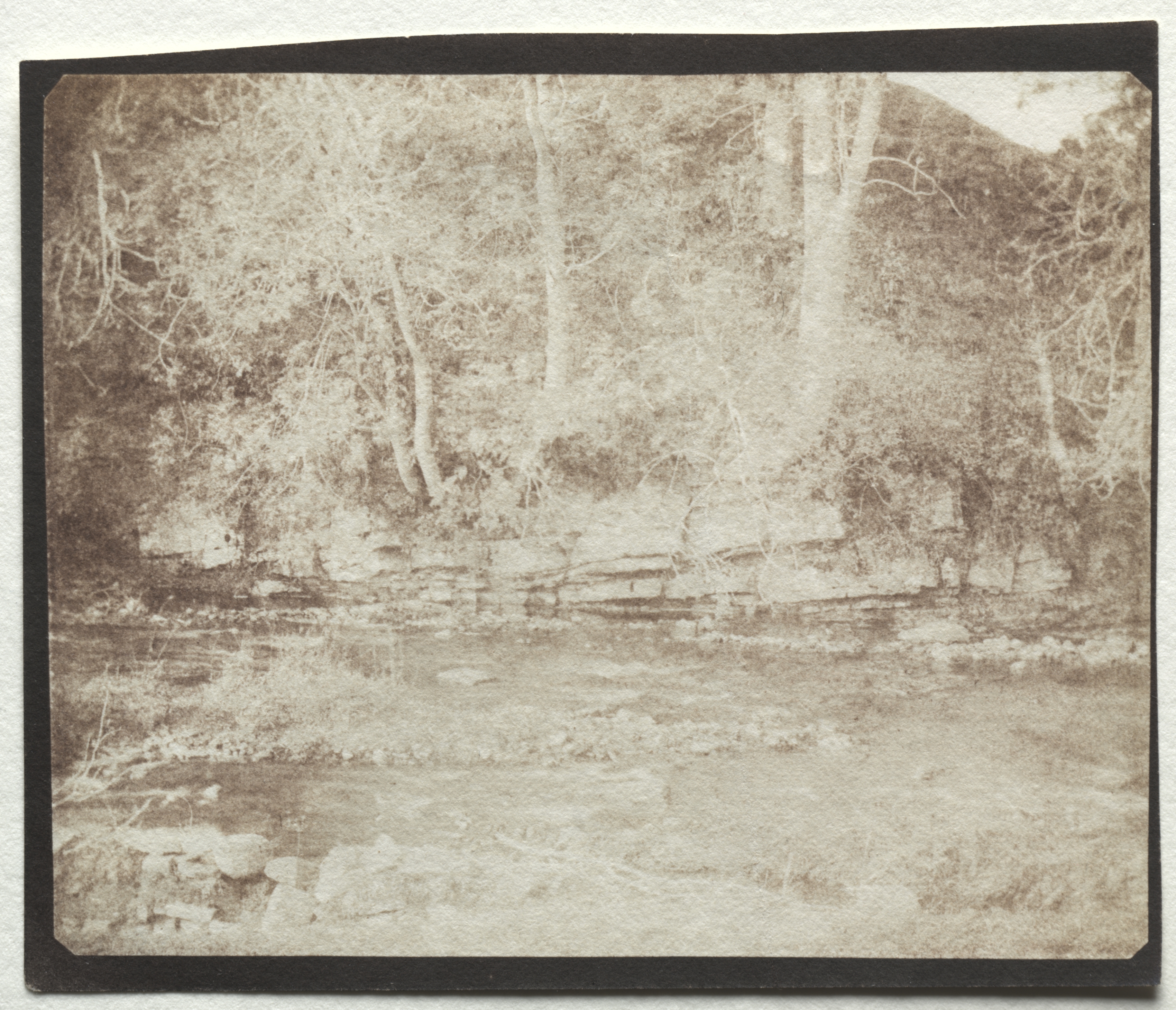 Sepia-toned photograph of a small stream flowing through a wooded area. The stream is in the foreground, with a rocky shoreline on the left side. The water appears shallow and calm. Behind the stream, there is a steep bank covered in trees and bushes. The trees are bare, suggesting the photo was taken during the fall or winter. The background is a hillside with more trees and a large hill or mountain rising up on the right side. The photograph has a black border around it, and the corners are slightly rounded.