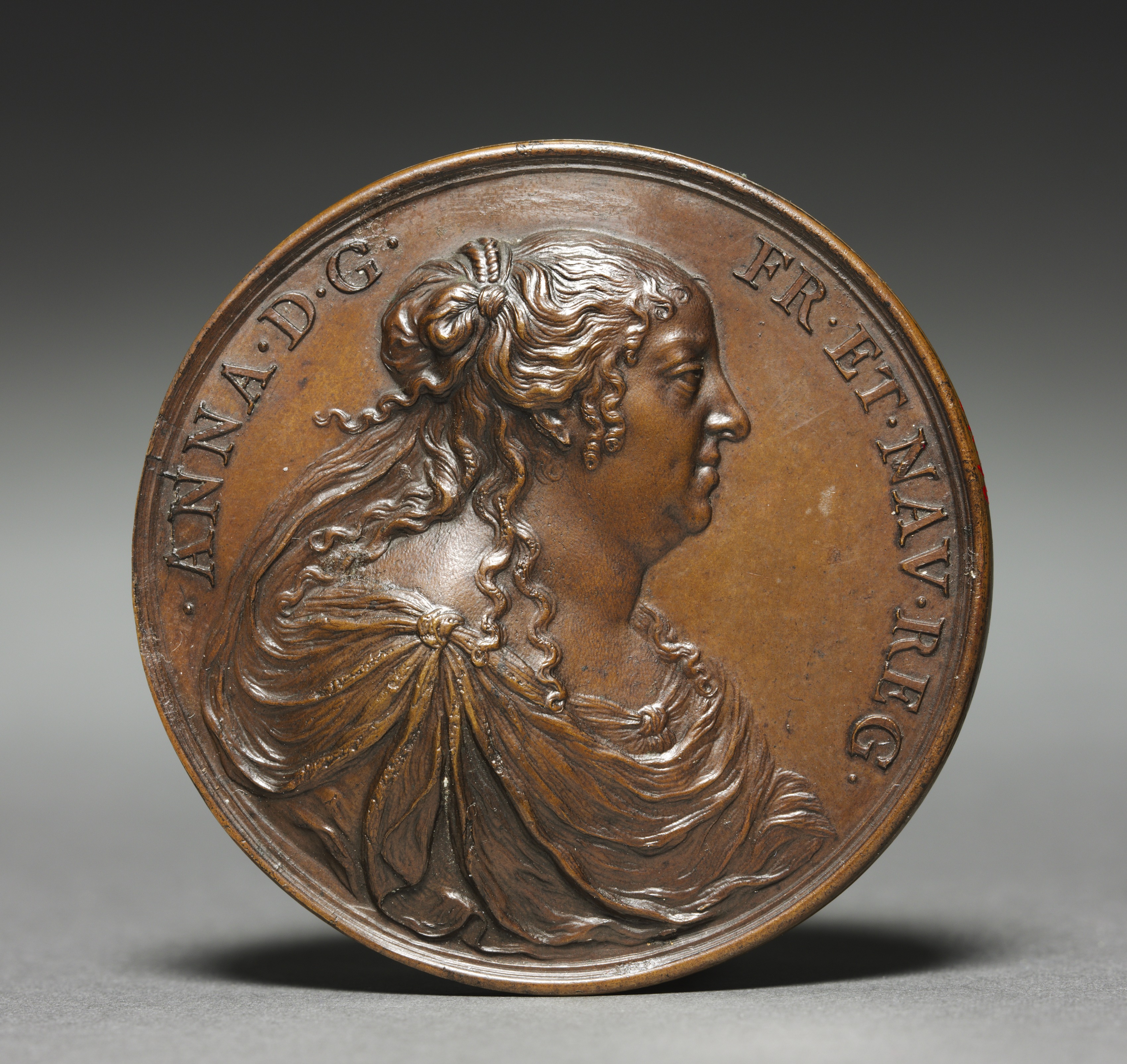 Copper-colored medal with raised image of woman's head and shoulders. Woman has curly hair pulled back with a bow at the top. She wears a low necked garment with folds of fabric covering the shoulders and chest. Her head is turned to the right, face in profile. Words around top edge of medal read "ANNA D G" on left and "FR ET NAV REG" on right.