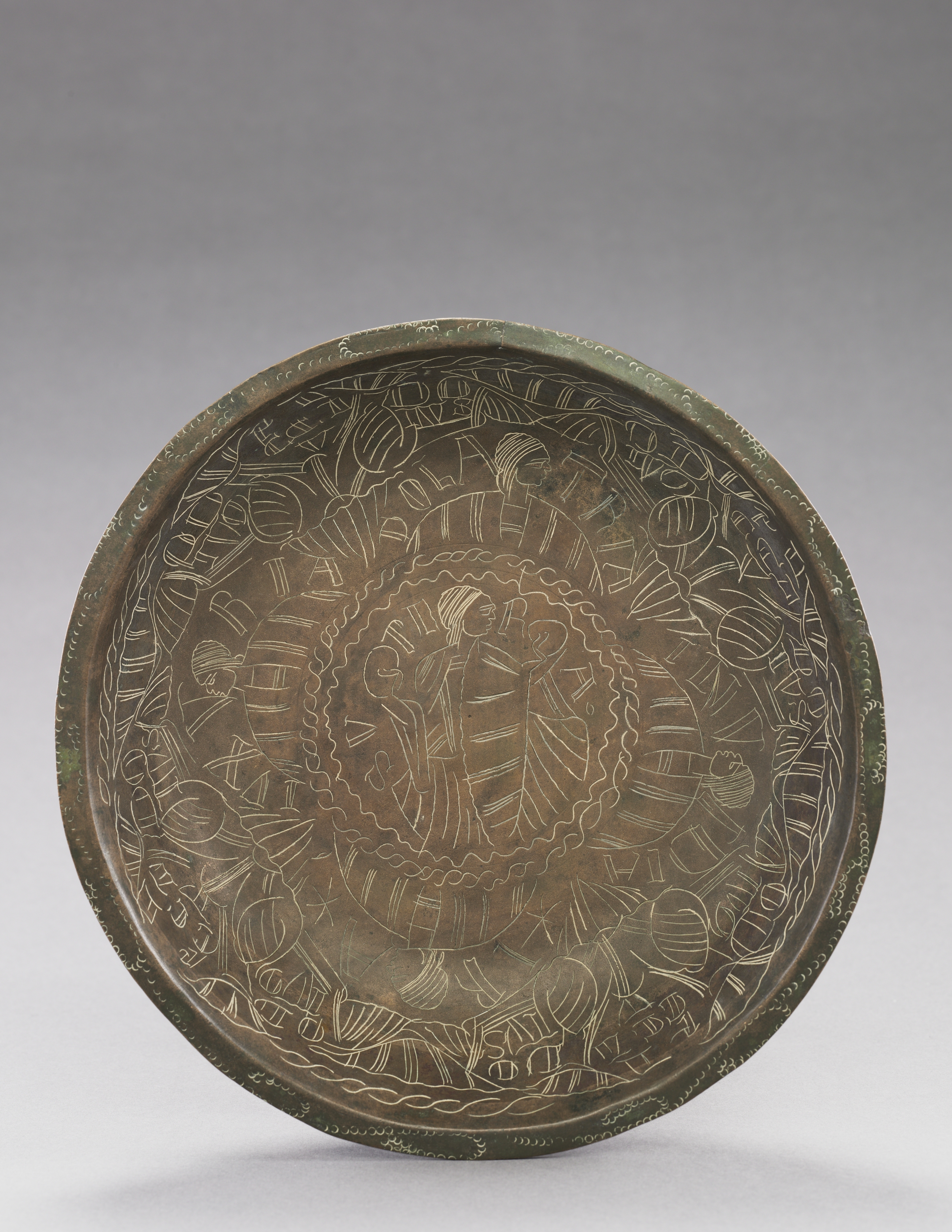 The bowl is round with an engraved design on its surface; made of bronze or brass, it appears to have a dark brown patina; the engraved design features several figures, likely representing various vices; figures are arranged around the bowl in a circular pattern; the bowl has a raised edge; the background of the image is grey, transitioning to white at the bottom. The bowl bears the title "Bowl with Engraved Figures of Vices".