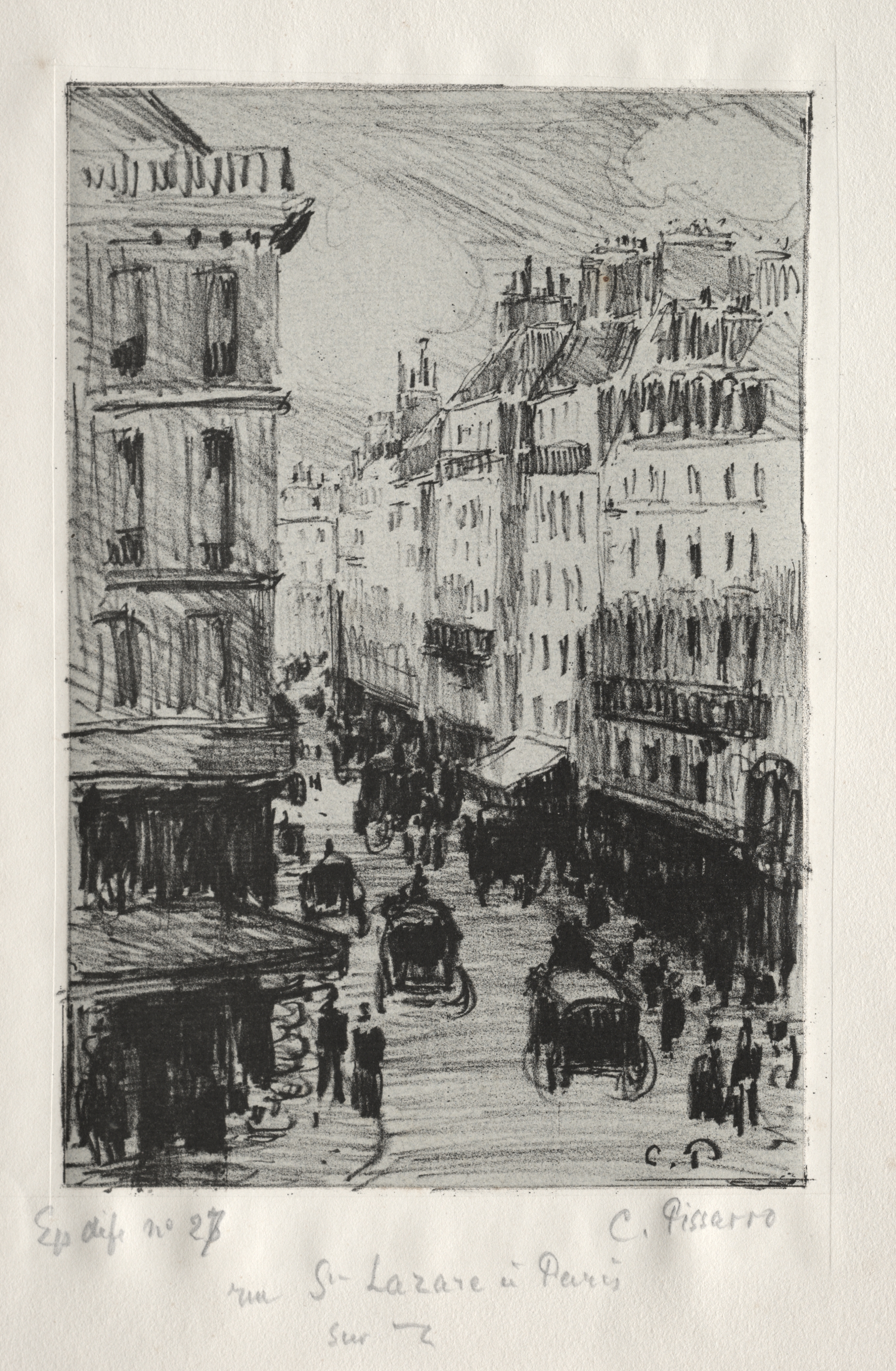 Black and white sketch of a city street. The street runs vertically through the center of the image, with buildings on either side. The buildings are tall and have many windows. Some of the buildings have balconies. The street has horse-drawn carriages and people walking on it. The sky is cloudy and gray. The image is drawn in pencil or pen and ink. The artist's signature is at the bottom right. The title of the work is written at the bottom center. The image has a white border around it. Handwritten text is at the bottom.
