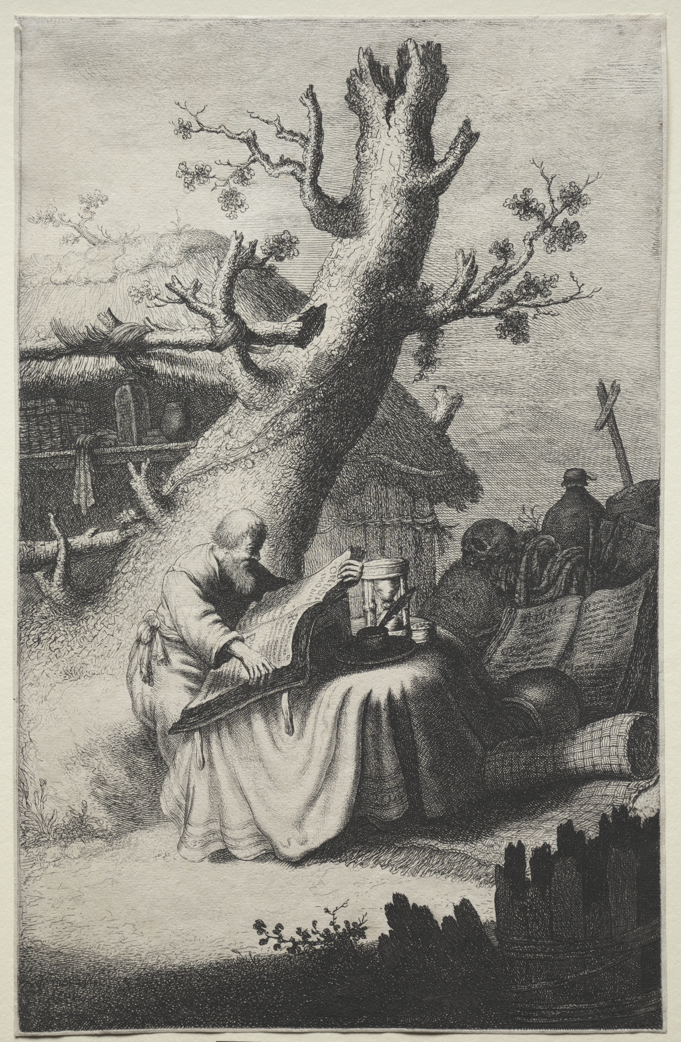 Black and white image of St. Jerome, by Jan Georg van Vliet. The image shows a man sitting on the ground under a tree with a lantern on a table in front of him. The man is wearing a robe and has a bald head. He is holding a book. There are papers and scrolls on and around the table. A lion is on the right side behind the table. In the background, there is a building with a thatched roof.