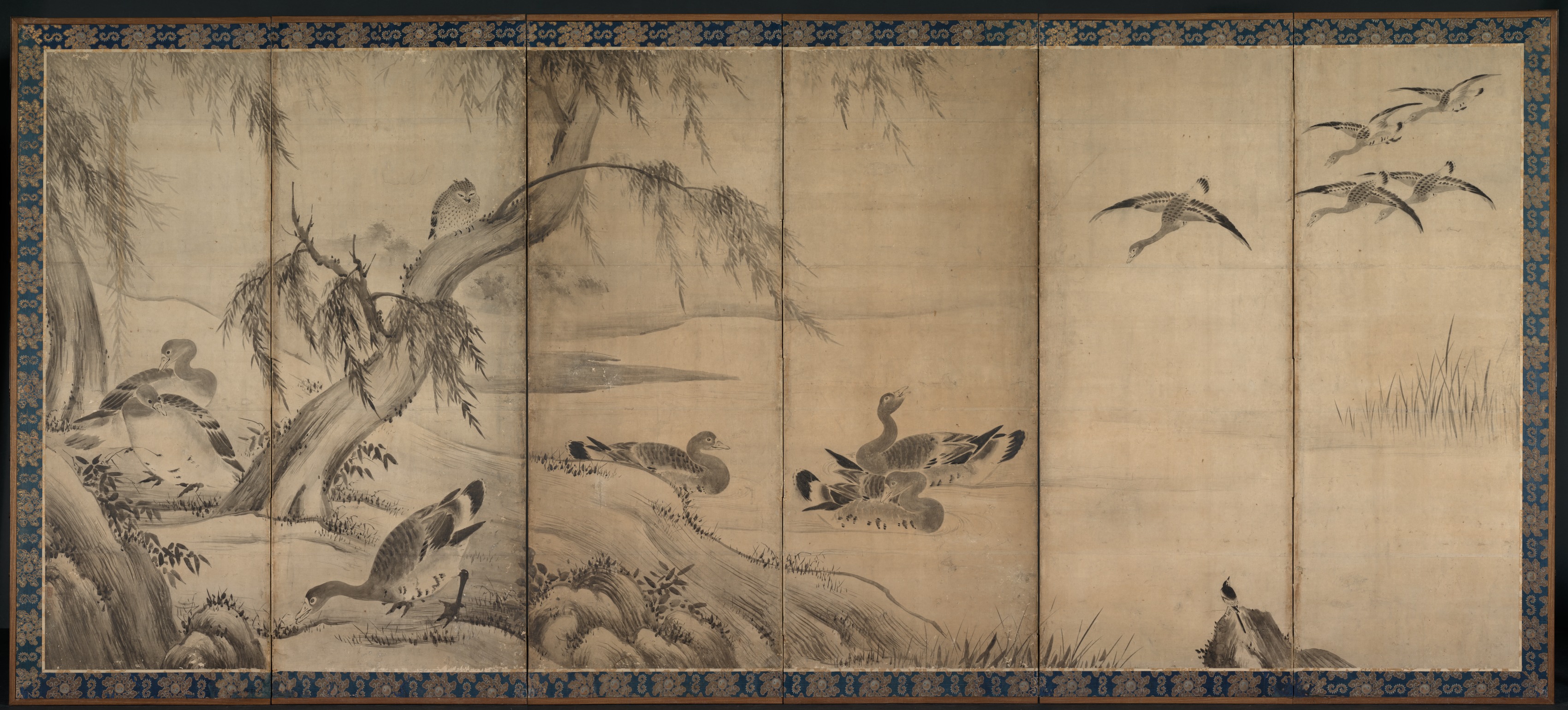 The image depicts a six-panel screen painting. A blue and gold patterned border frames the screen. The panels are a light brown color. A landscape scene with geese is painted on the screen. On the left side, a tree leans down to the ground. A goose sits on the ground under the tree, another goose flies toward the right, and a third goose sits on a branch. In the middle, a body of water appears behind the tree. Three geese are on the ground next to the water and one goose is flying. On the right side, four geese fly toward the right. A grassy shoreline and a goose in the water are also on the right. The background is a hazy sky.