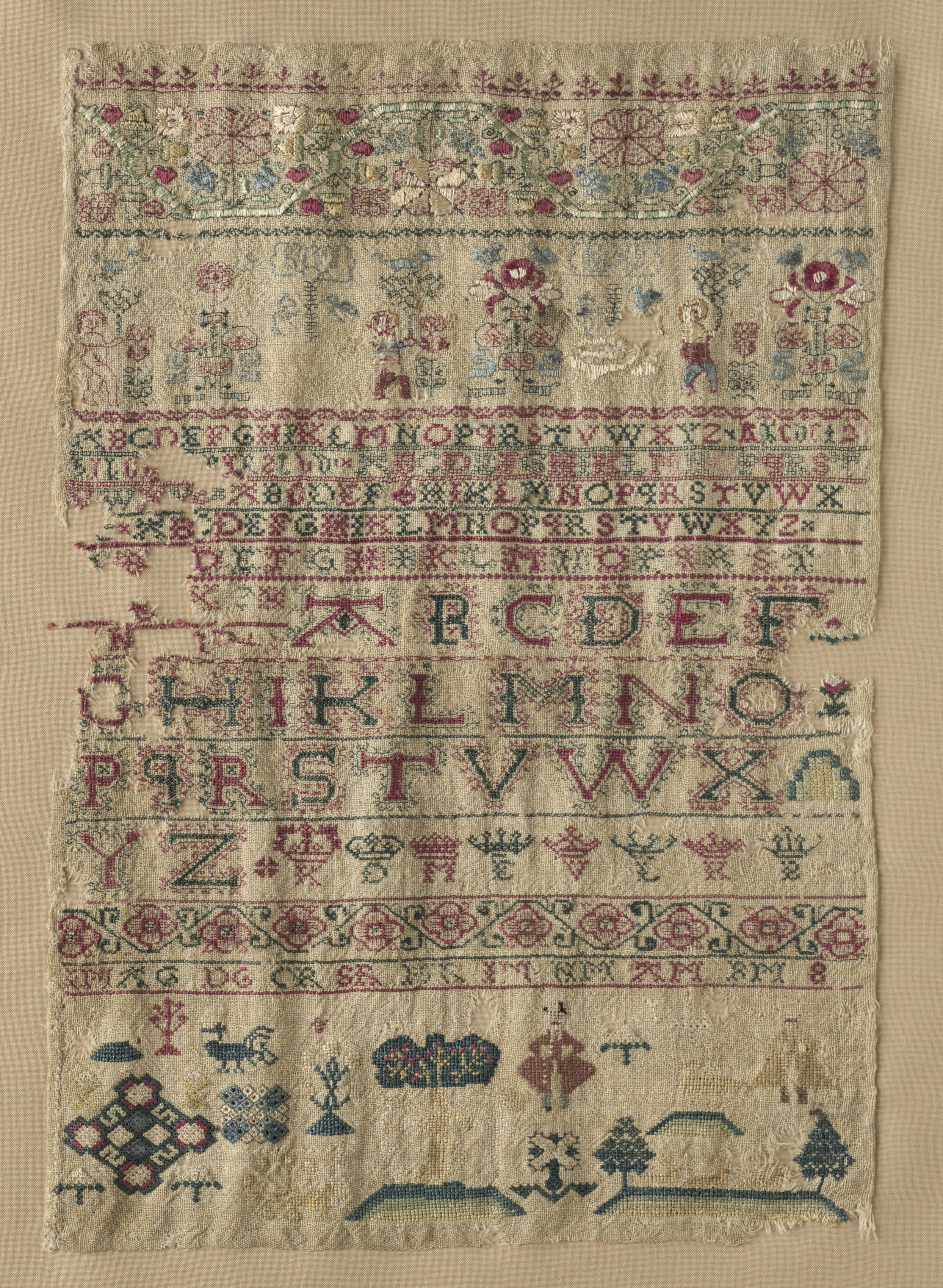 Beige fabric with frayed edges. Multicolored cross-stitch embroidery featuring alphabet rows and decorative motifs. The top section has two rows with floral patterns in pink, blue, green, and red. Below, three rows of alphabet letters in red, blue, and green with decorative borders. Bottom section includes various shapes and designs like animals, trees, a house, and geometric patterns in shades of blue, green, and red. The background is beige. Title: Sampler. Artist: Unknown.