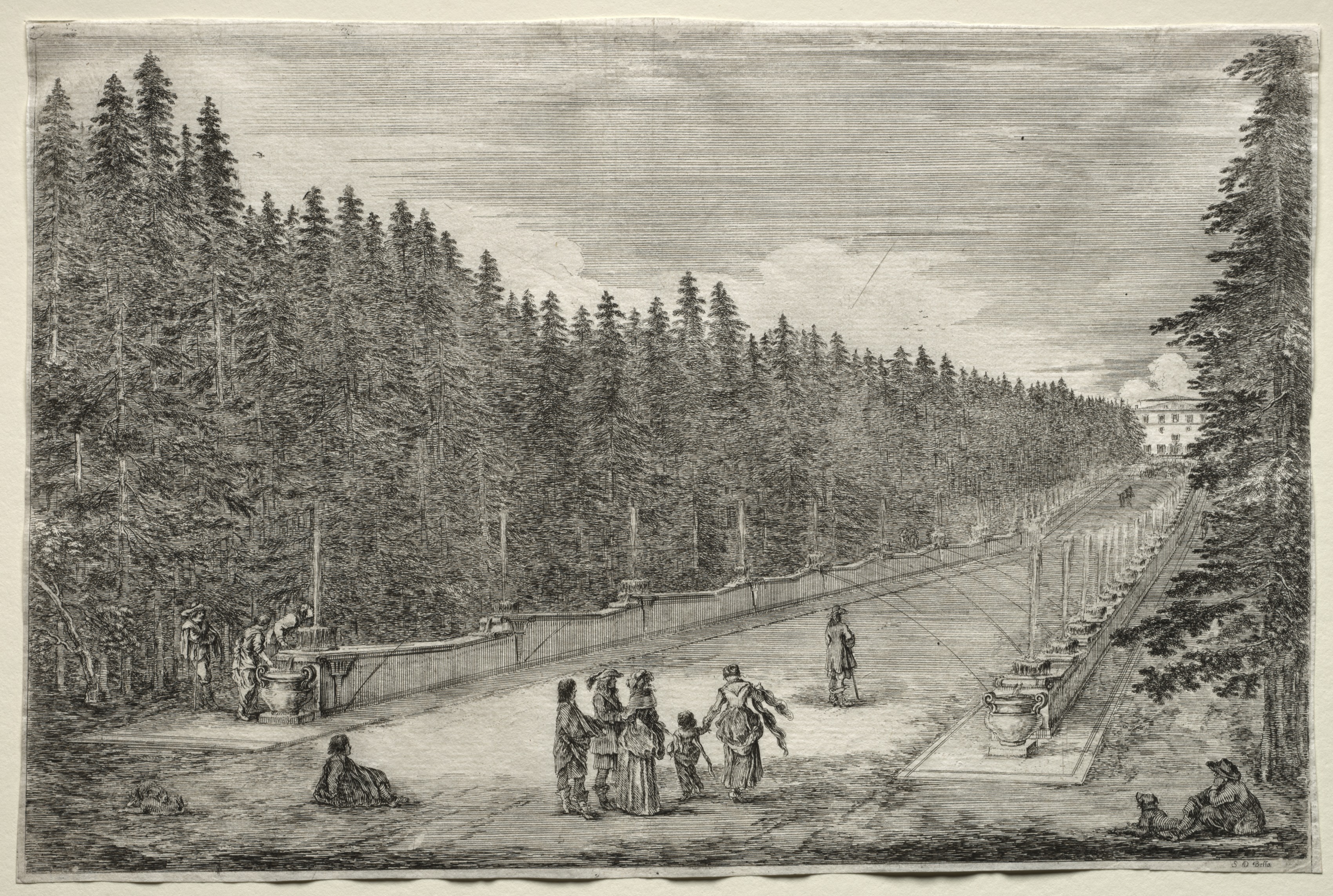 Black and white drawing of a group of people on a path with tall evergreen trees and a large building on the right side in the background, depicting views of a villa. The group consists of adults and children. The path has fountains on both sides. The drawing by Stefano Della Bella is titled "Views of the Villa of Pratolino". The scene shows people casually strolling. The sky is cloudy and mostly covered. The image is framed by a border.