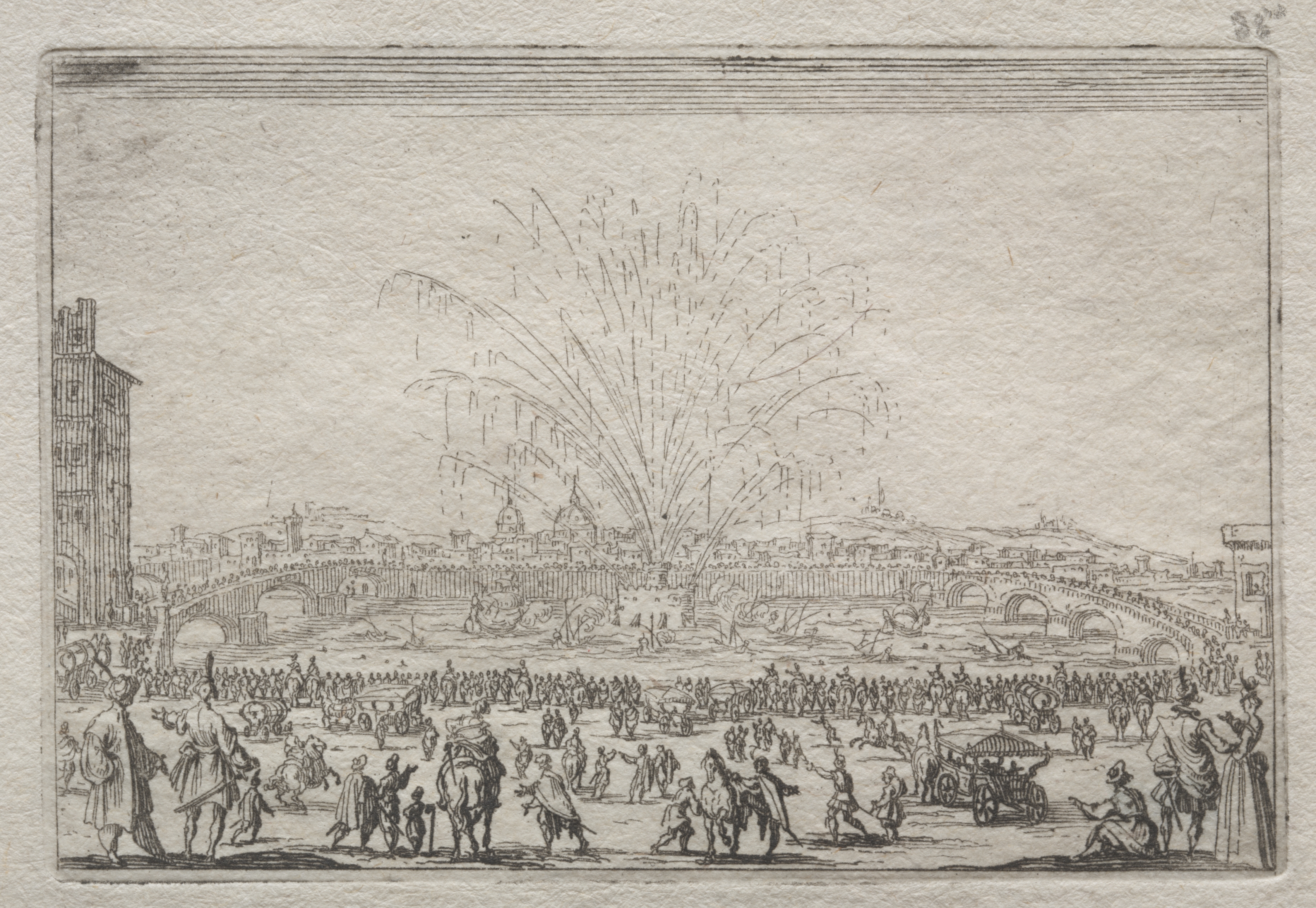 The image depicts a black and white drawing of a city scene with fireworks exploding in the sky. The scene is set on a river with a bridge spanning it, and people are gathered on the riverbanks and bridge. The bridge has multiple arches and appears to be made of stone. In the foreground, people are standing and walking around, some on horseback, others in carriages. Fireworks explode in the sky above the bridge, creating a burst of lines radiating outward. The drawing is framed by a border with a thin line around the edge. The artist's style is detailed, with many people and objects depicted in the scene. The title of the work is "Fireworks on the Arno" and the artist is Jacques Callot.
