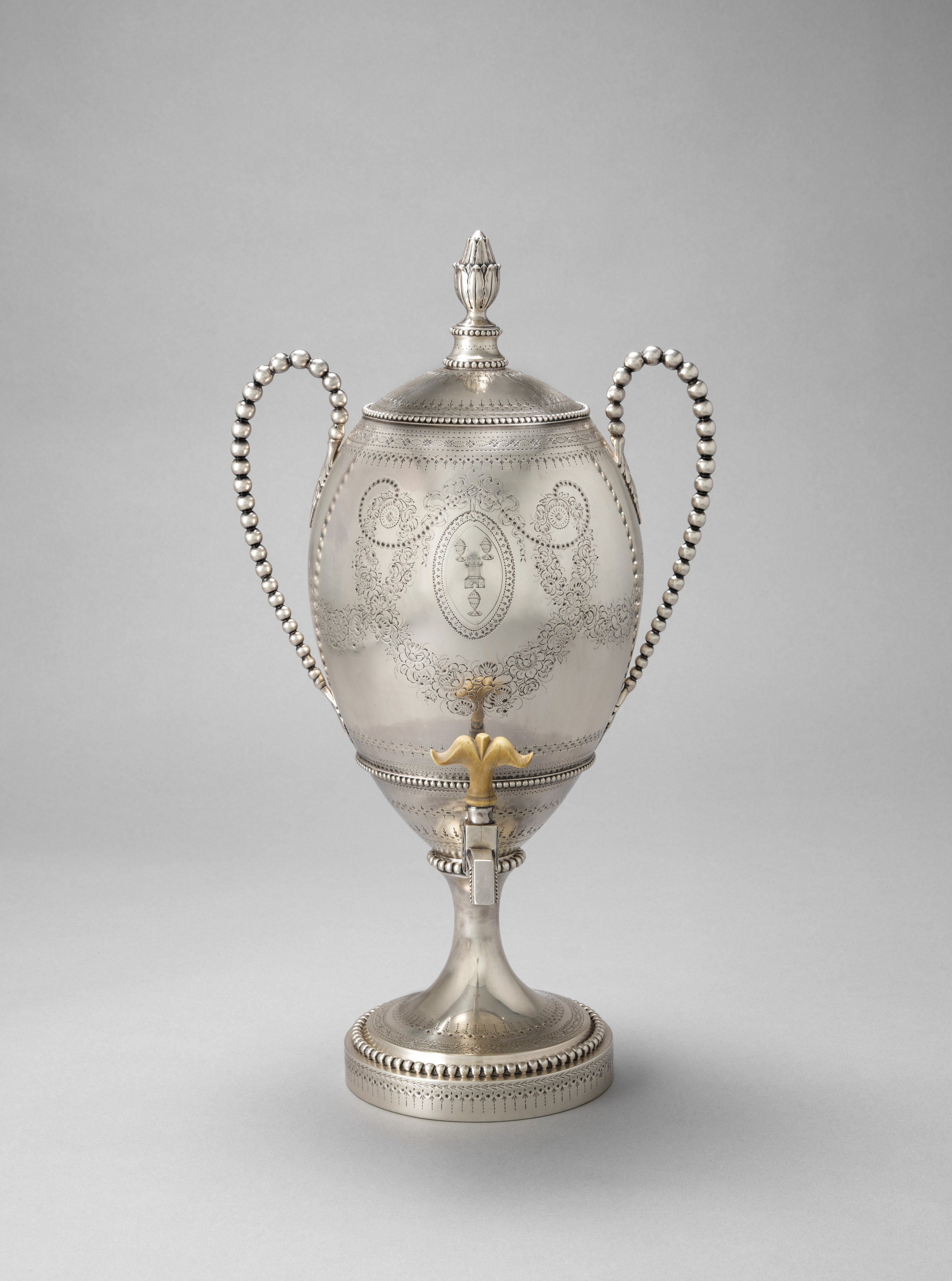Tea Urn by Henry Greenway. The urn is made of silver and features a bulbous body with a narrow neck and a small finial on top of the lid. The body has a wide, rounded shoulder and an etched design. There are two handles on either side, each made up of a series of small silver balls. The base of the urn is round and flat with a decorative edge. The spout is positioned on the front and is adorned with gold.