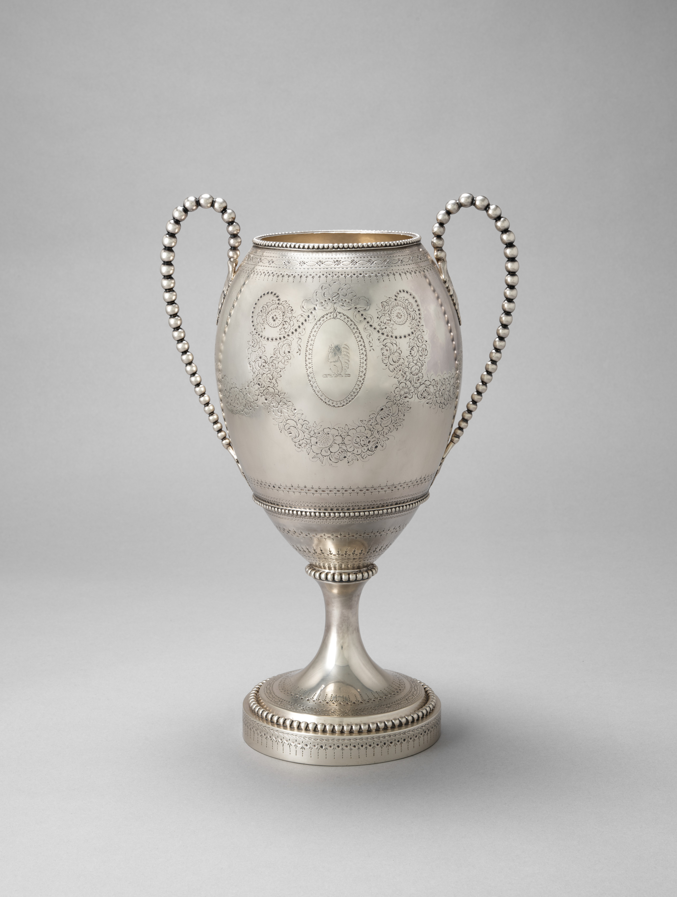 Silver tea urn, "Tea Urn" by Henry Greenway. The urn is shaped like a trophy, with two handles on either side. The handles are made of a beaded chain. The urn body is bulbous with an etched design on the front. The design features etched floral patterns within a circle on either side of a central etched shield. The urn sits on a short, thin stem that widens into a circular base. The base, stem and handles are decorated with beading. The inside of the urn appears to be gold or has a gold lining. The background of the image is light gray. The urn is centered in the image.