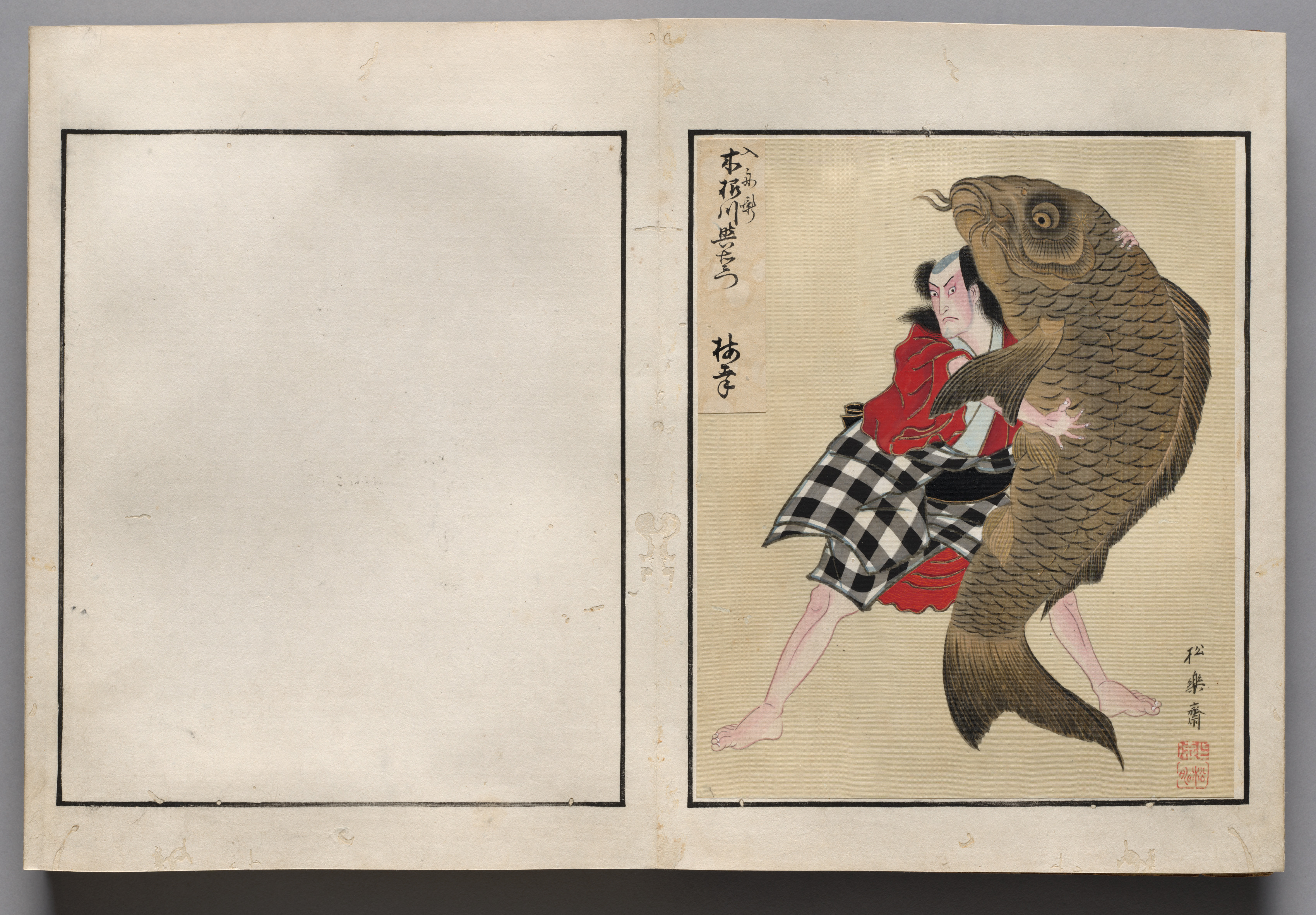 Double-Leaf from Album of Actor Portraits by Shōrakusai: The image shows a beige background with a black-lined rectangular border. The left side of the image is empty within the border. On the right side, a man wearing a black and white checkered garment and a red garment is depicted. The man has one leg extended and the other bent, with his body turned to the left. He appears to be embracing or being embraced by a large fish. The fish is brown with darker brown scales and a lighter brown tail. The fish's head is positioned above and to the right of the man's head. There are several Japanese characters written vertically on the right side of the image. A red seal is located at the bottom right.