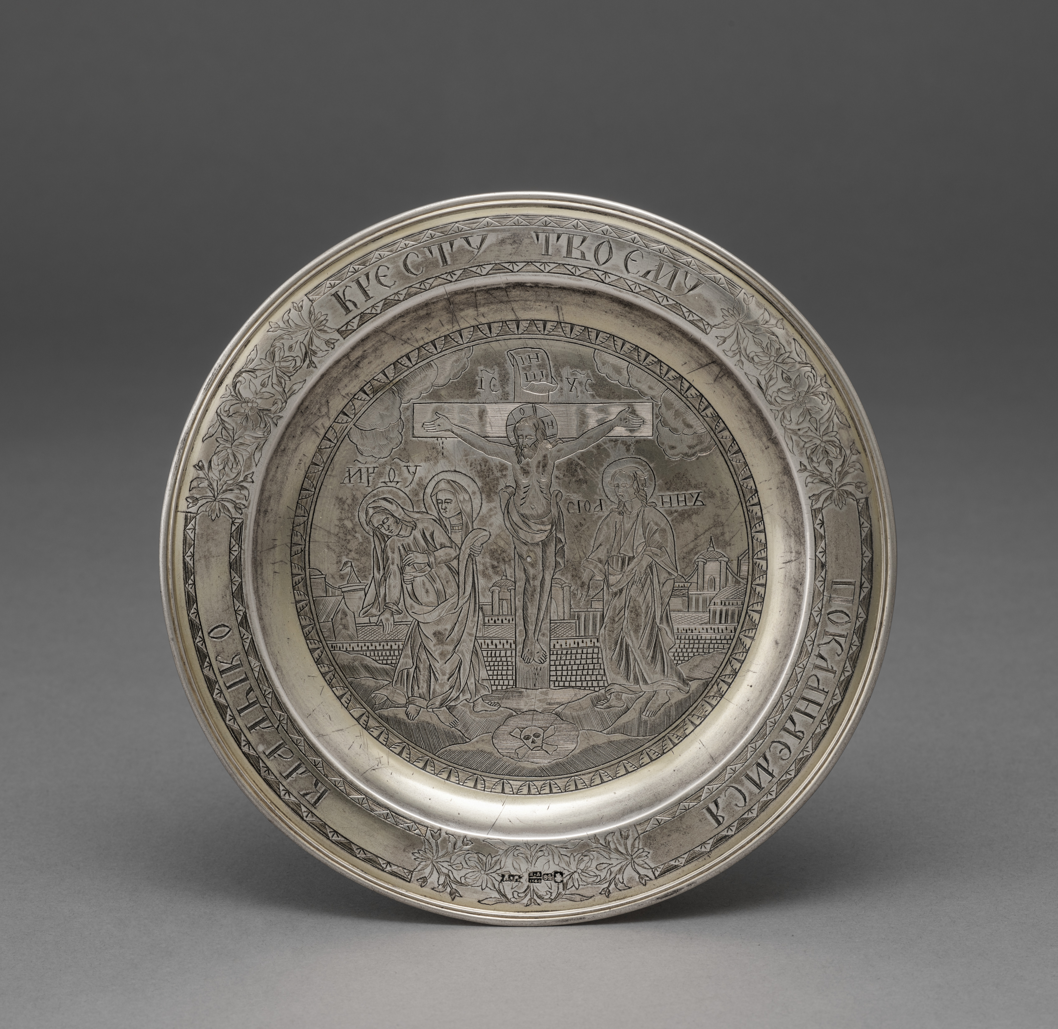 Silver plate with a raised rim and engraved design. The center shows a crucifixion scene with Jesus on the cross, and two figures on either side. The figure to Jesus' right is a woman holding a baby; the figure to Jesus' left is a man in a long robe. A cityscape is in the background. The plate's border features an outer ring with floral patterns and an inner ring with text in a foreign language, possibly Cyrillic. The plate appears to be old and weathered, with scratches and dark spots on its surface.