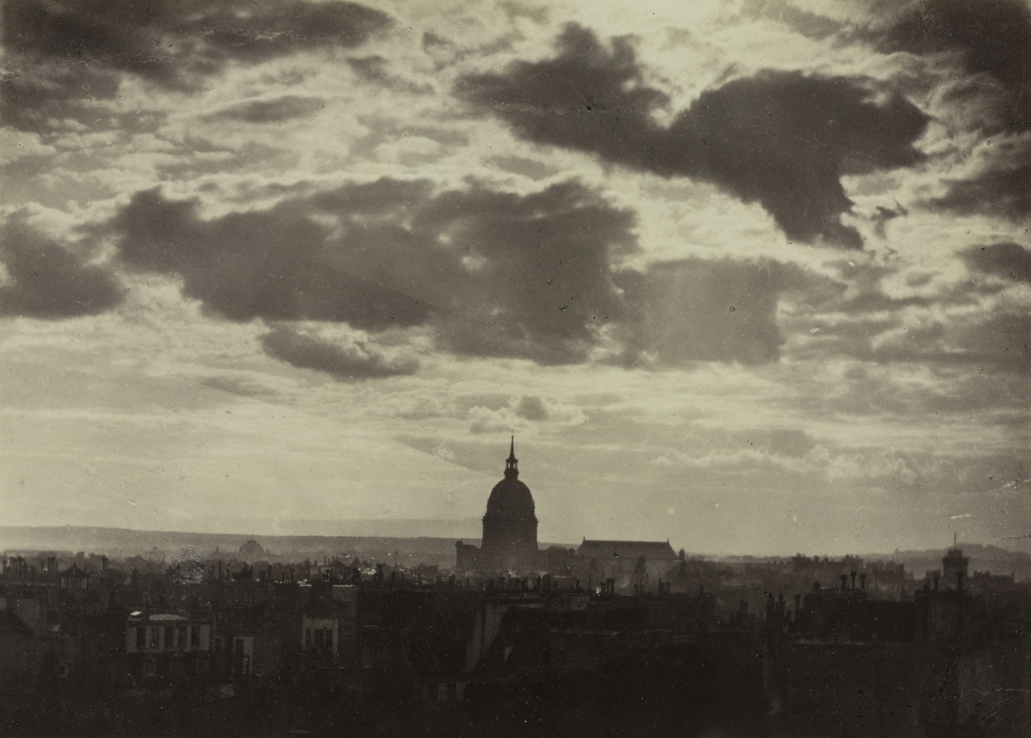 Black and white photograph of a cityscape. The sky occupies most of the image, with dark and light gray clouds. Below the clouds is a city skyline with a large building featuring a dome and spire. The dome appears near the center of the image. There are numerous rooftops and chimneys. The image is grainy with visible scratches.