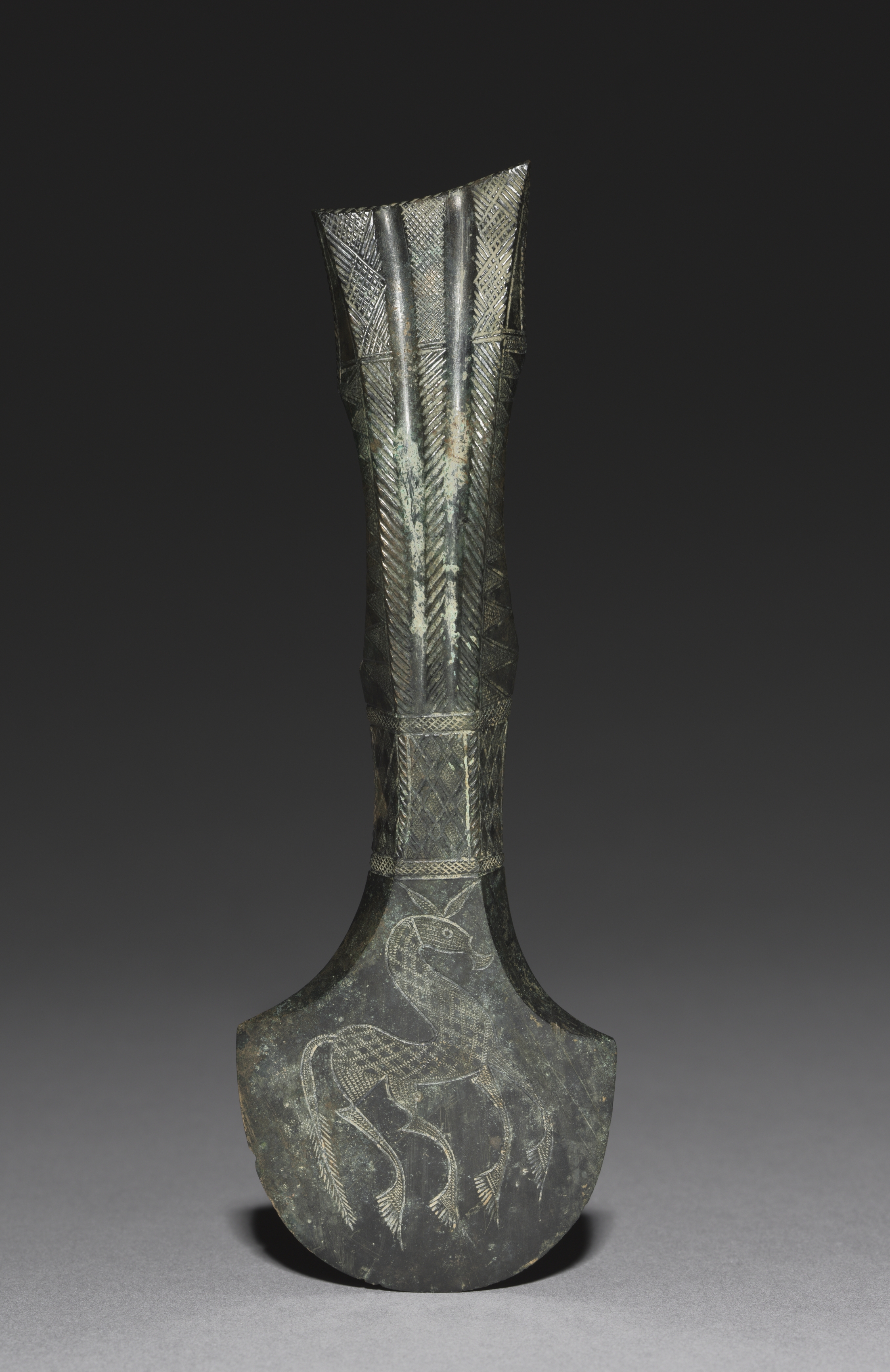 The image depicts an axe head by an unknown artist titled "Axe Head". The axe head is made of dark-colored metal, possibly bronze or copper, with a weathered appearance. The head of the axe is curved and wide, with a rounded edge. The handle opening is flared and trapezoidal. The surface features engraved designs, including three fish on the bottom half and feather-like patterns on the top half. The background is dark gray to black, with the axe casting a shadow on a light gray surface.