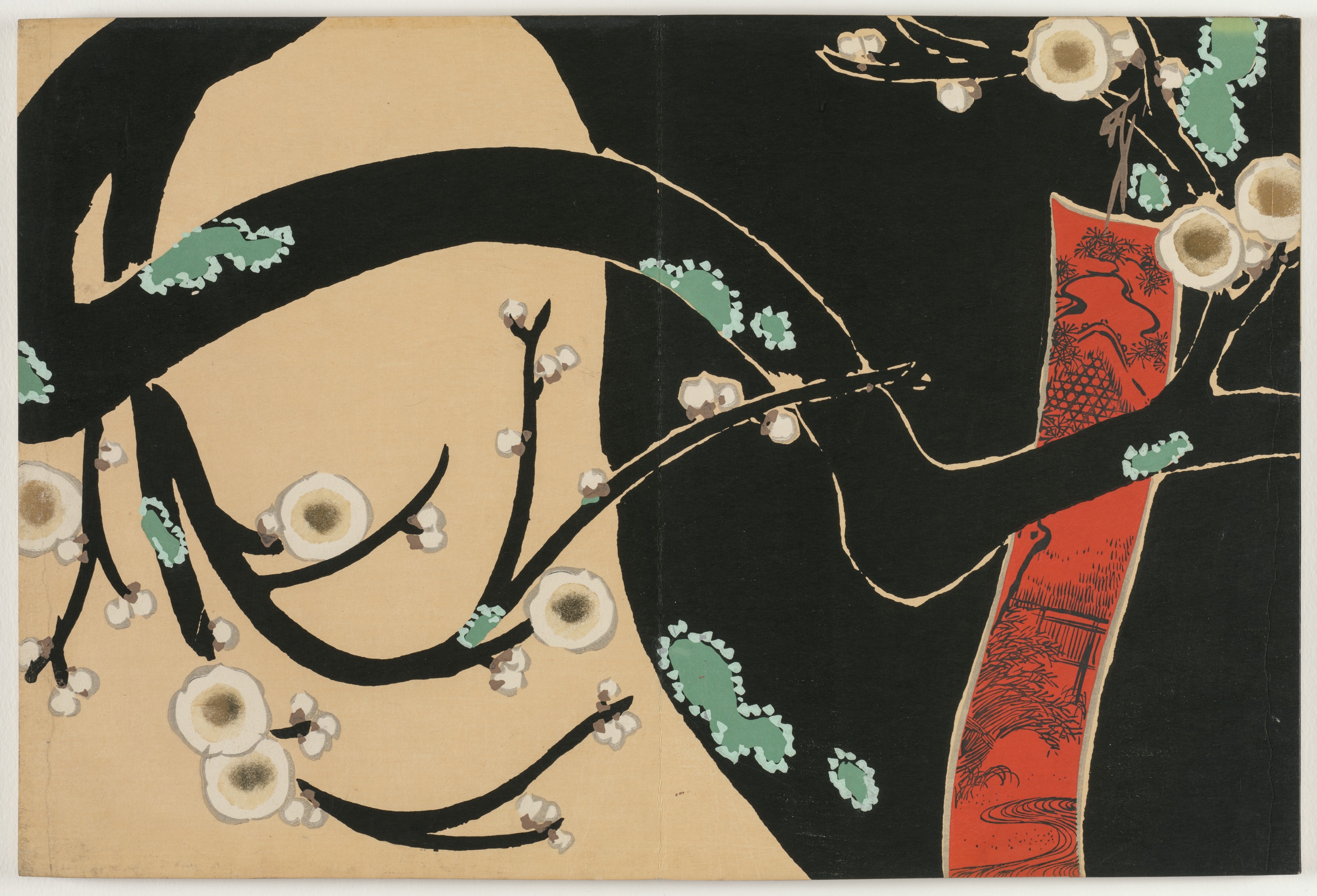 A black tree branch with white flowers and green leaves extends from the right side to the left, over a red and black background with a beige area on the left; a red insert on the right has a black design on it.