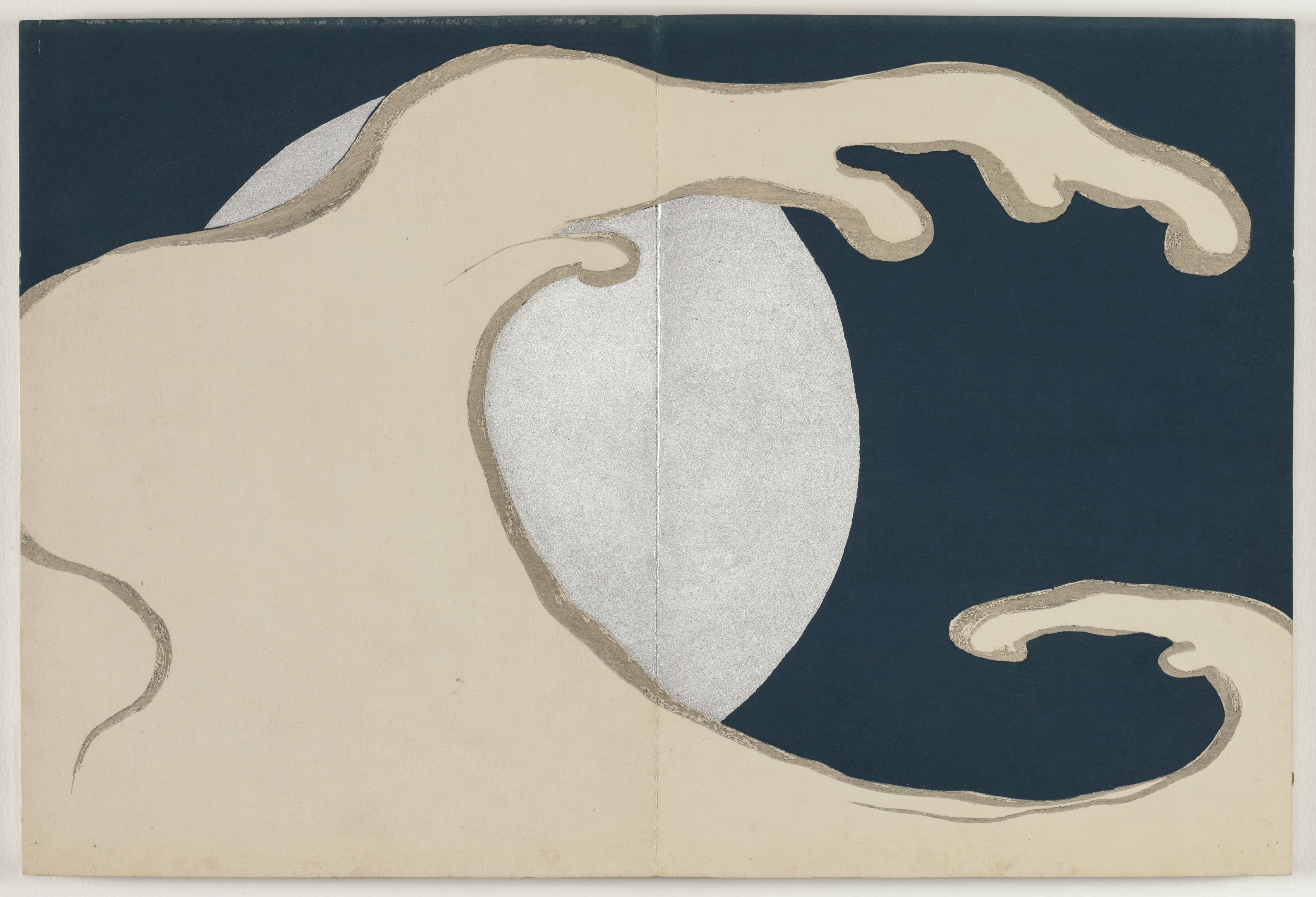 The image shows a stylized depiction of a wave. The wave is beige with a gray outline. A thin gray line runs through the middle. The wave has a curved shape, with the top of the wave curving to the right and the bottom curving to the left. The wave appears to be in motion, with the top part of the wave cresting and the bottom part curling under. The background of the image is dark blue, with a white circle behind the wave's middle. The wave is set against a beige background that fades to a darker beige around the edges. The artwork depicts the title "Rising Waves" by Kamisaka Sekka.