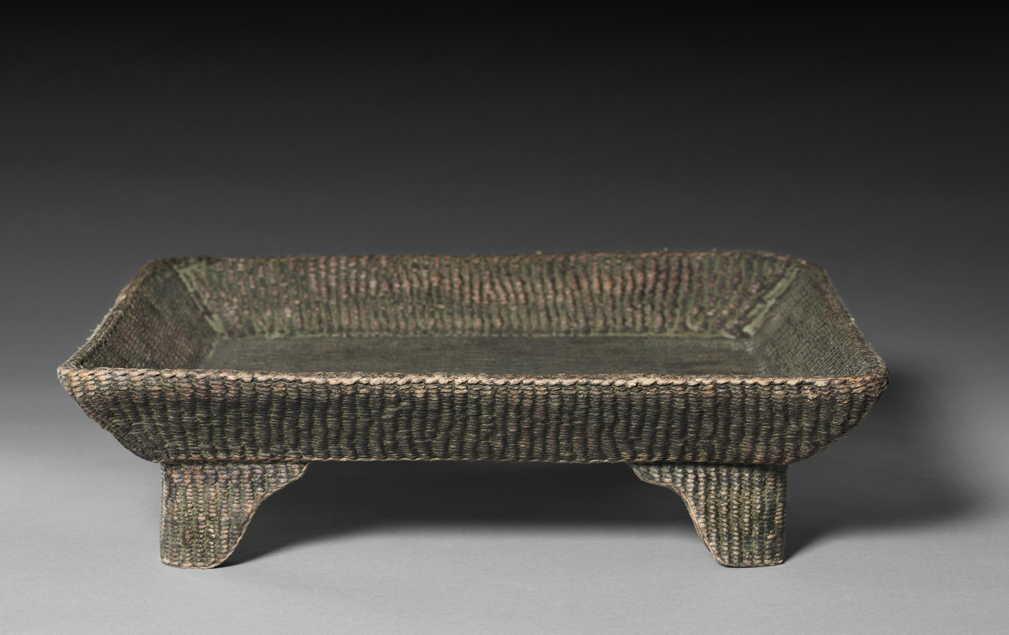 Footed tray by Leach. Rectangular woven tray with four short legs. Tray has a flat bottom and slightly sloping sides, with a textured surface featuring a repeating pattern of raised lines. The tray's edges are slightly raised, and the legs are tapered and slightly curved outward. The tray appears to be made of woven fibers, possibly rattan or wicker, and has a mottled green and brown coloration with lighter edges. The background is dark gray to black, with a lighter gray surface that the tray is sitting on.