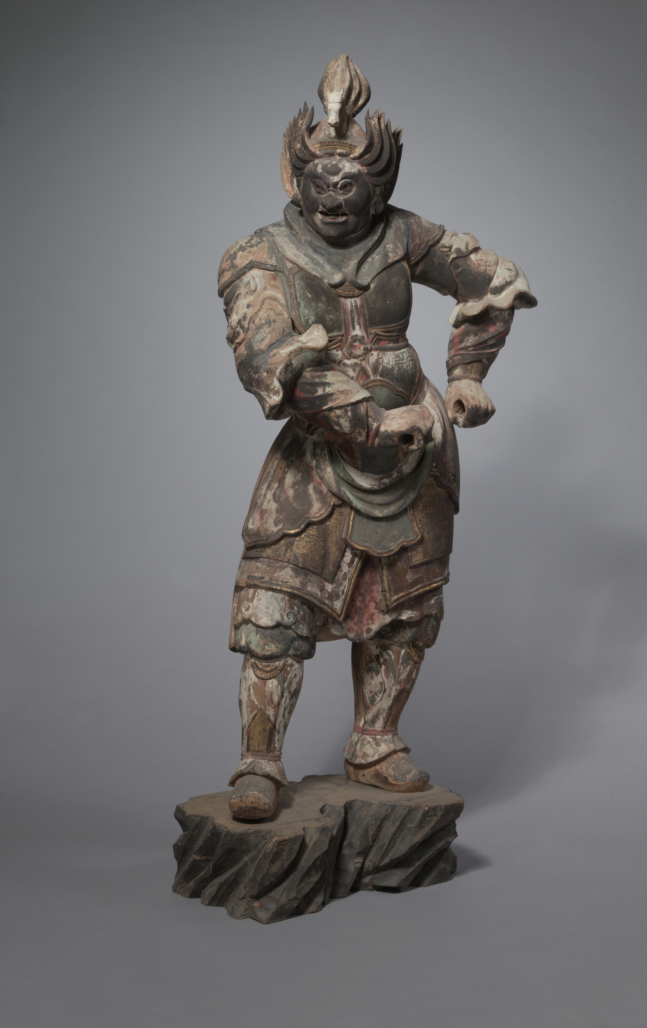 A Heavenly General (One of the Junishinsho) by Unkei, depicts a standing figure on a rectangular base with a concave top and jagged edges; the figure wears a crown-like headpiece with a flame-shaped finial; face is dark with a wide mouth and bulging eyes; body wears a short skirt and armor with scales; both arms bent at the elbow.