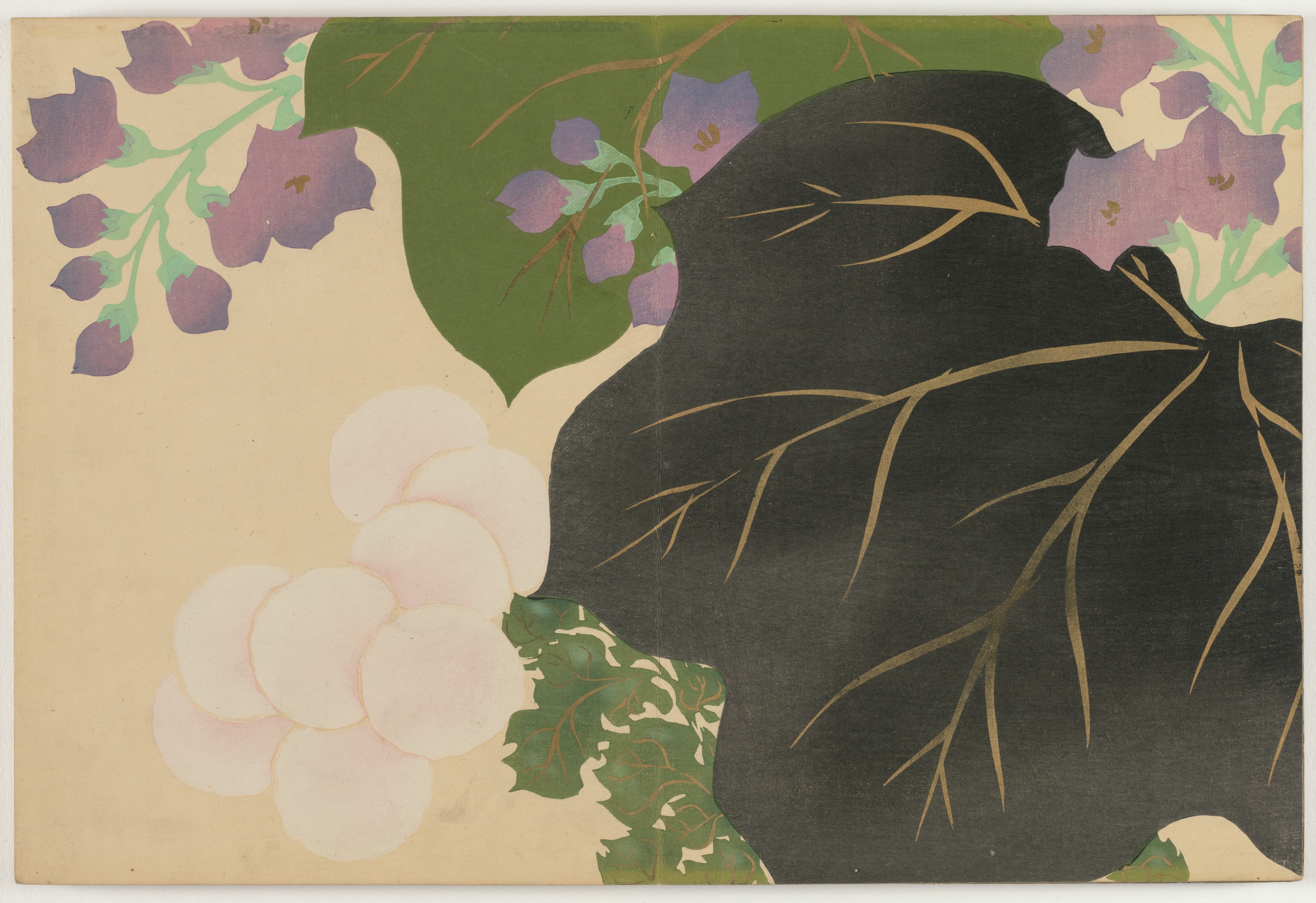 A painting depicts a floral arrangement. The painting features a large black leaf with gold veins on the right side. Several green leaves are at the bottom and top of the painting. A cluster of white flowers with pink edges is on the bottom left. Purple flowers with green stems are at the top. The background of the painting is beige.