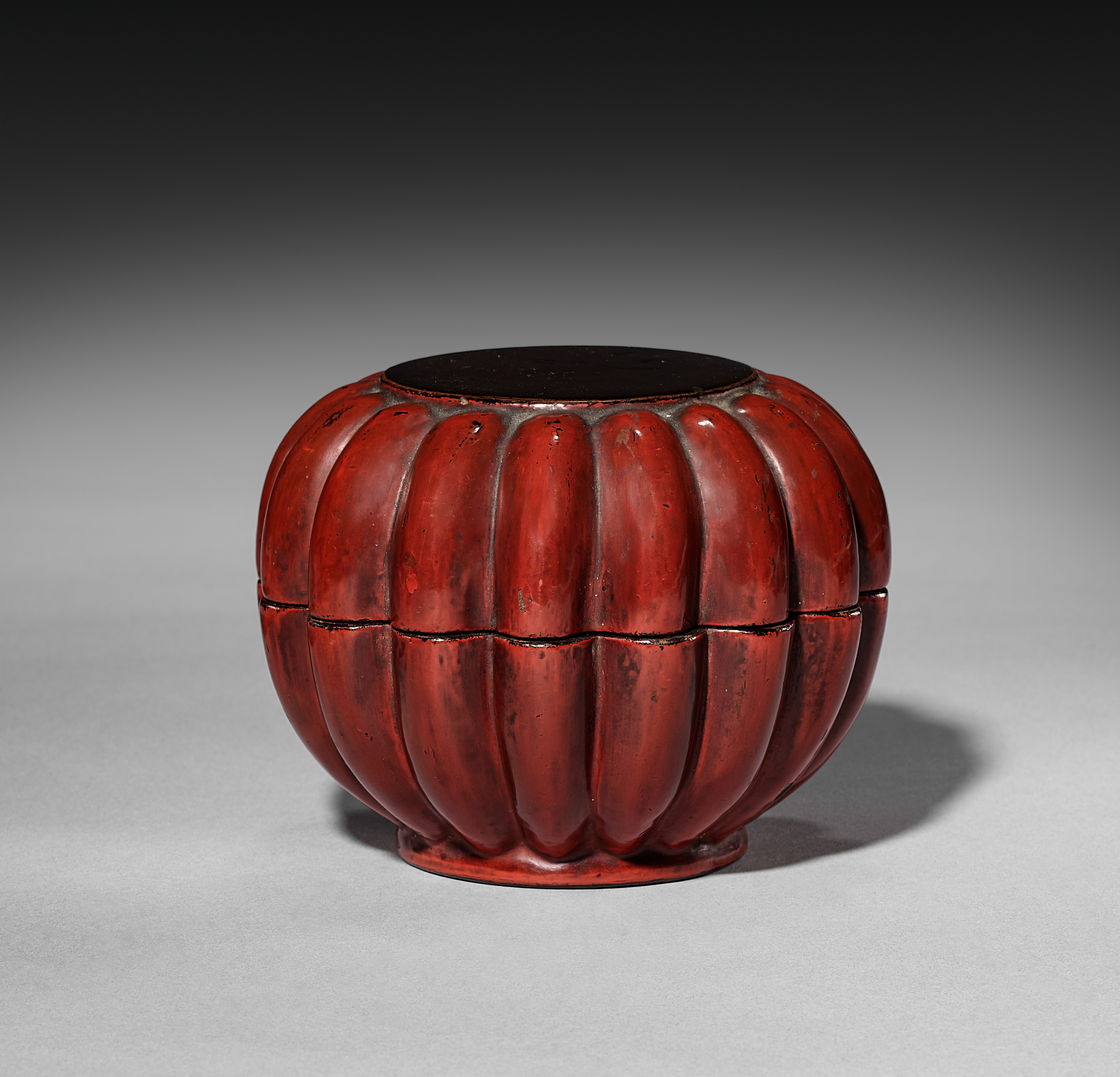 Red lacquer tea caddy, two-piece, with a rounded body featuring vertical ribs, resembling a gourd or pumpkin shape, and a flat top with a small lip; the interior is black; the exterior shows signs of wear and aging; on a gray background with a shadow underneath.