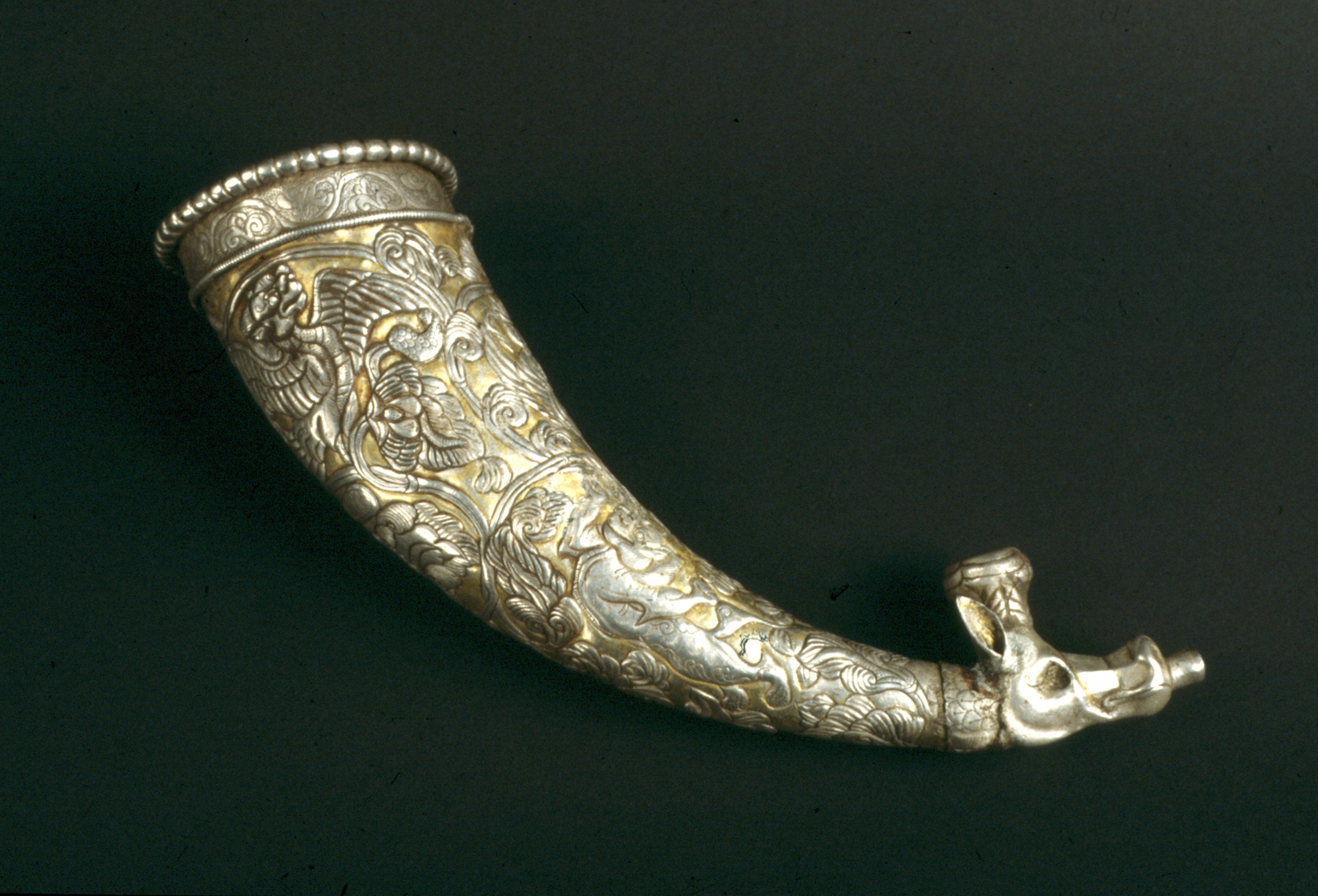 The Rhyton by Carl Spitzweg depicts a silver-colored metal drinking horn with intricate engravings. The horn has a wide mouth and a narrow end, with a decorative spout at the end. The engravings on the horn include floral patterns and figurative scenes. The object is positioned diagonally on a dark green background.