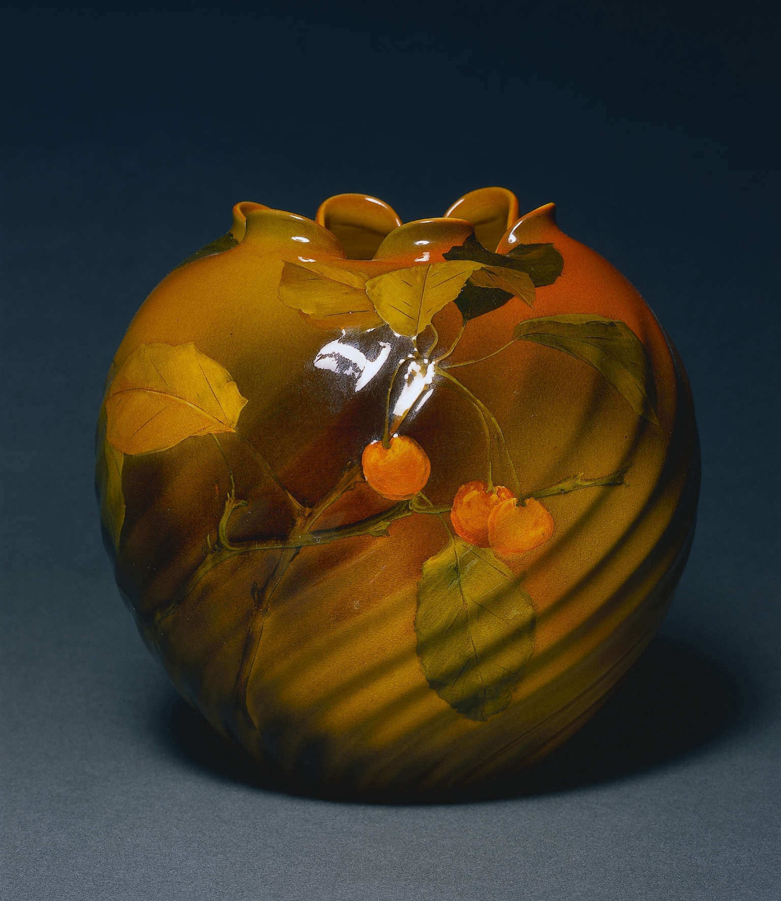 The vase by Rookwood Pottery Company is a rounded, bulbous ceramic object with a glossy finish. The vase has a wide body that tapers slightly towards the top, which features a ruffled, wavy edge. The color of the vase is predominantly shades of orange and yellow, with a darker tone at the base that lightens towards the top. The vase has a painted design featuring green leaves and two small orange fruits or flowers on a stem. The background of the image is dark blue-gray, with the vase casting a shadow on the surface below it.