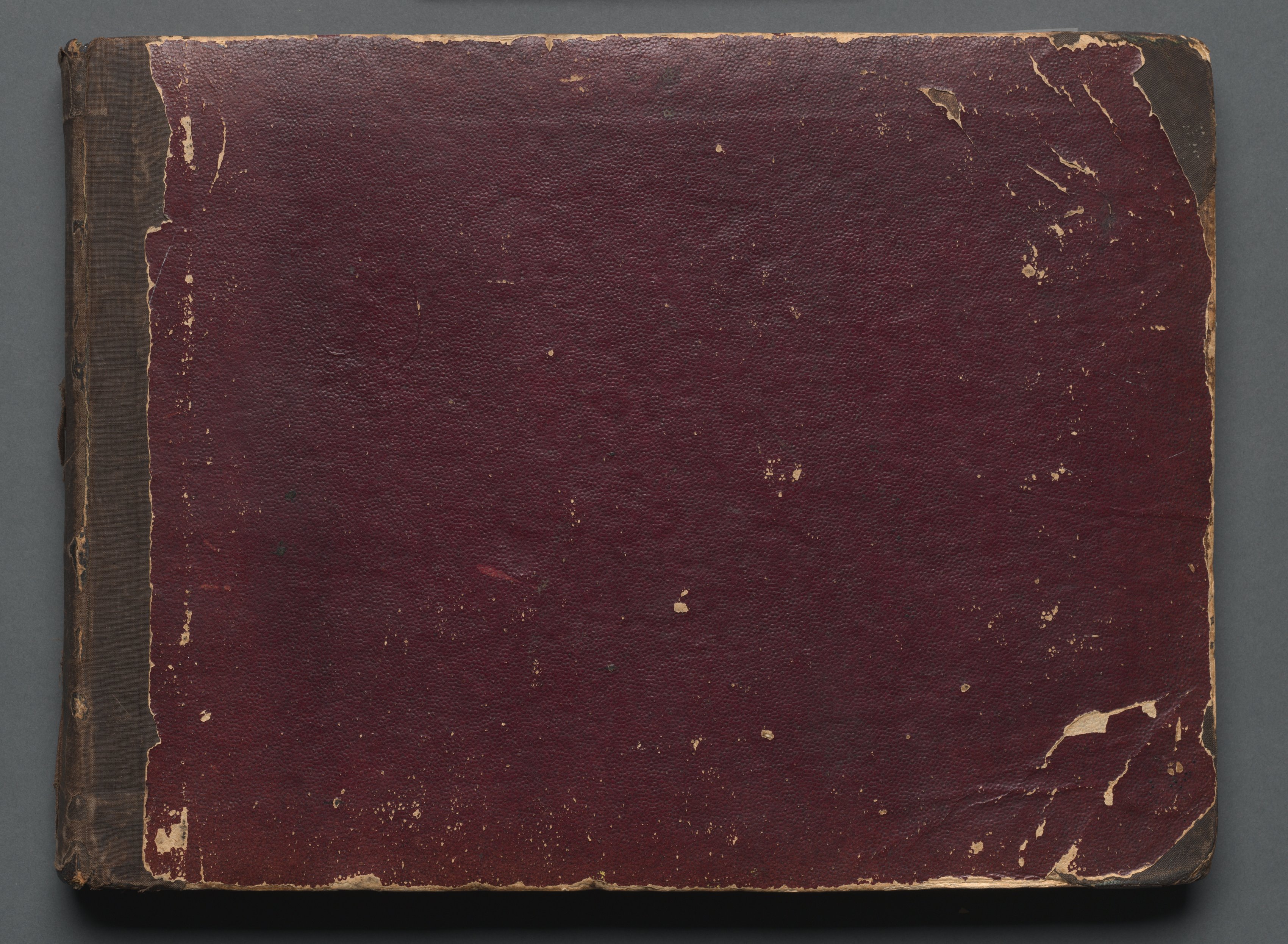 The image shows a closed book with a maroon leather cover. The cover is rectangular with rounded corners. It has a dark brown fabric spine and corners. The maroon leather is peeling and cracked in several places, with some areas showing the brown fabric underneath. The cover also has some lighter brown spots and scratches. The book is lying flat on a gray surface.