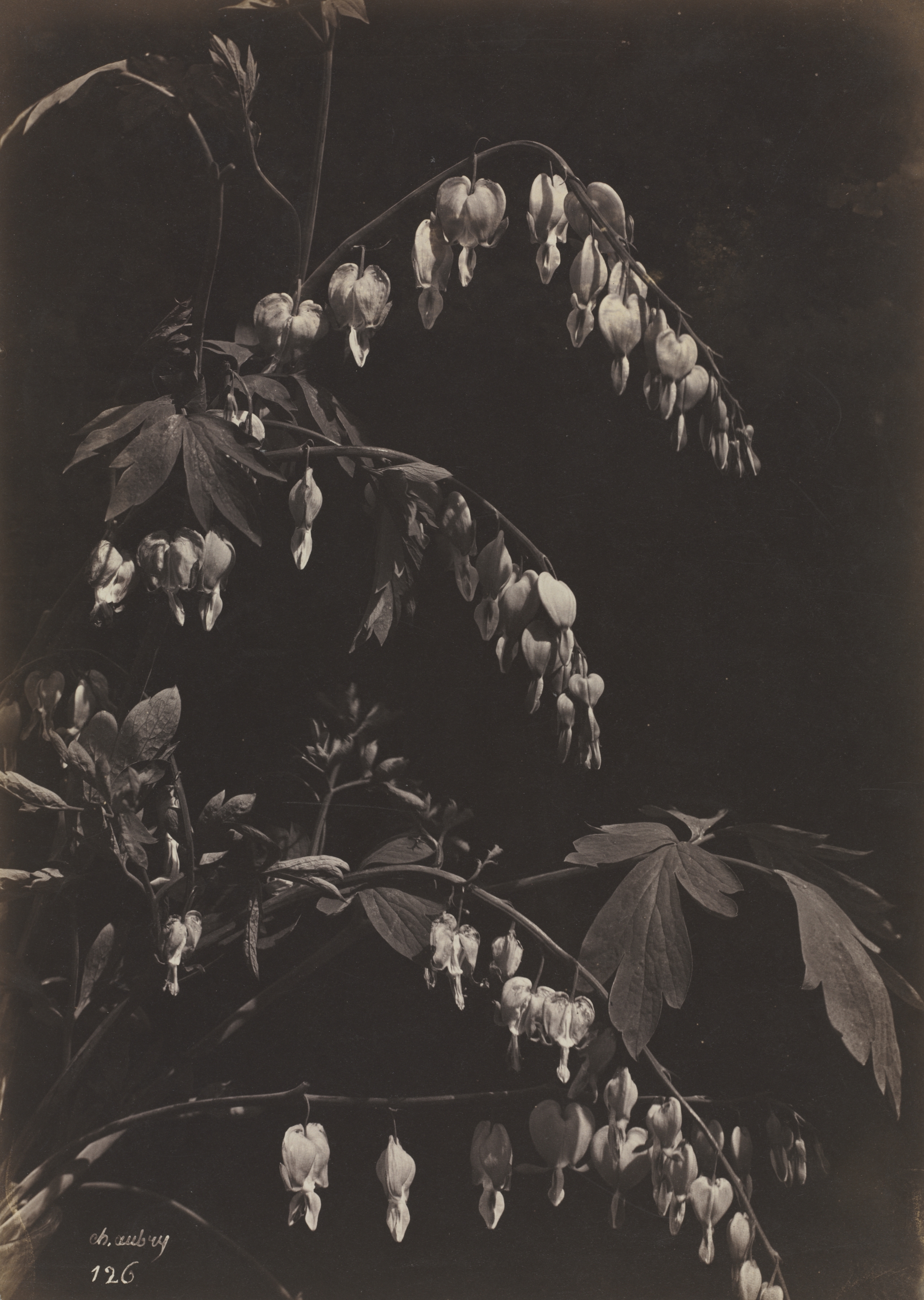 Black and white photograph of a plant with drooping, heart-shaped flowers and green leaves. The plant has several stems with clusters of flowers hanging down. The flowers are heart-shaped and have a drooping appearance. The leaves are green and have 3-5 pointed lobes. The background is dark. The image is in a sepia tone. The photographer's signature is in the bottom-left corner.