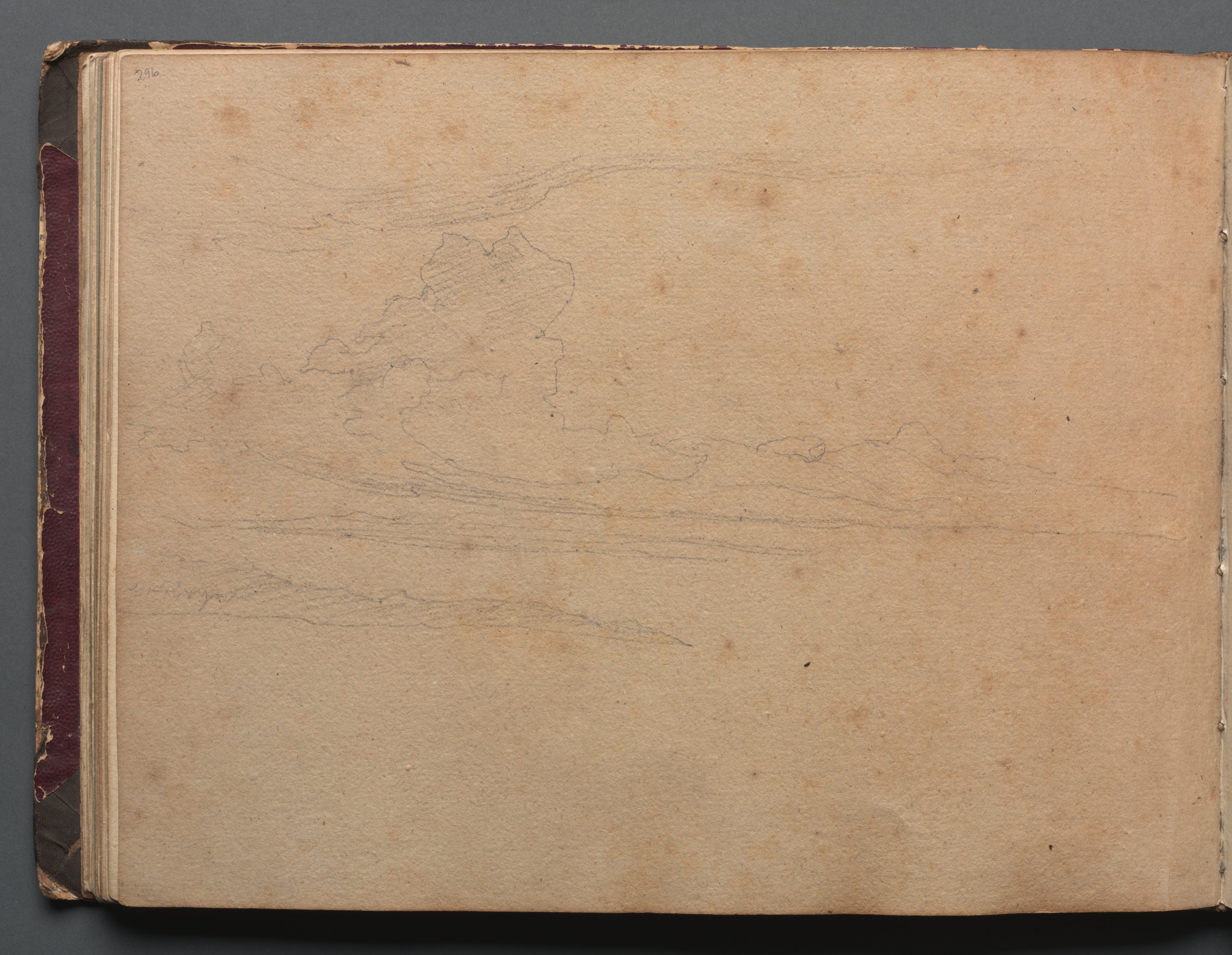 Tan-colored paper with darker spots. A gray landscape sketch. The paper is rectangular. A red spine on the left. A gray background. A white border on the right. A black background underneath.